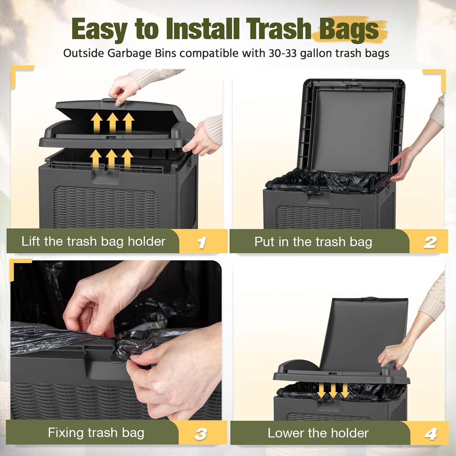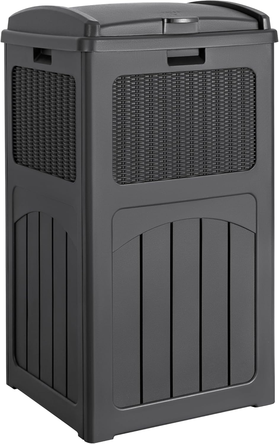 - Dual Lid Design: Innovative dual lid design hides trash bags for a tidy yard, the outer lid opens and closes easily with one hand and the inner lid stabilizes trash bags in place.