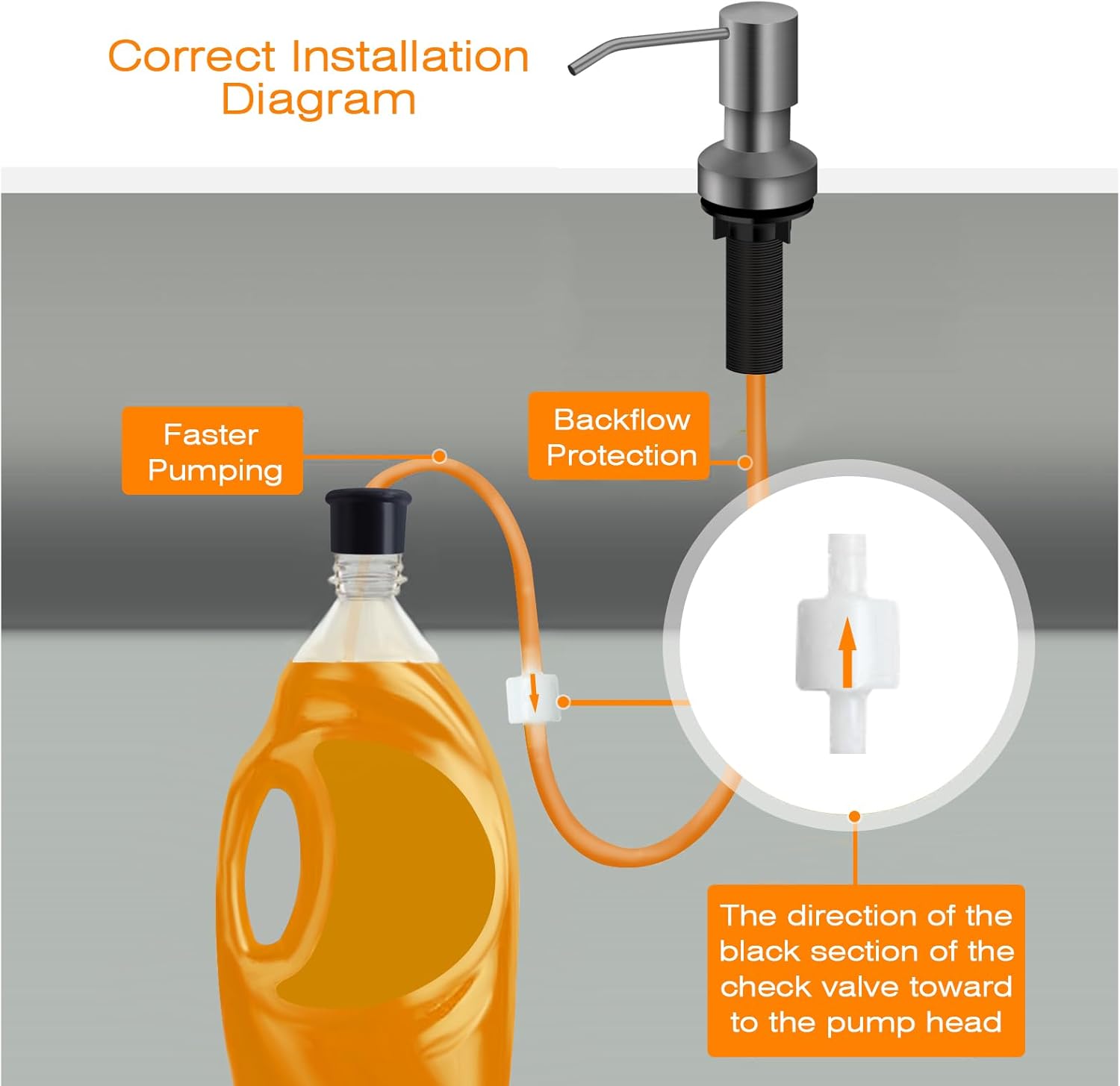 - Premium Quality & Durable: The kitchen sink soap dispenser is made of 304 stainless steel and premium quality PE plastic. Multi-layered brushed nickel finish makes it rust proof, so it has higher durability and reliability. Food-Grade silicone tube is soft and elastic, not easy to bend under the countertop, the check valve make the soap prime in the tube.