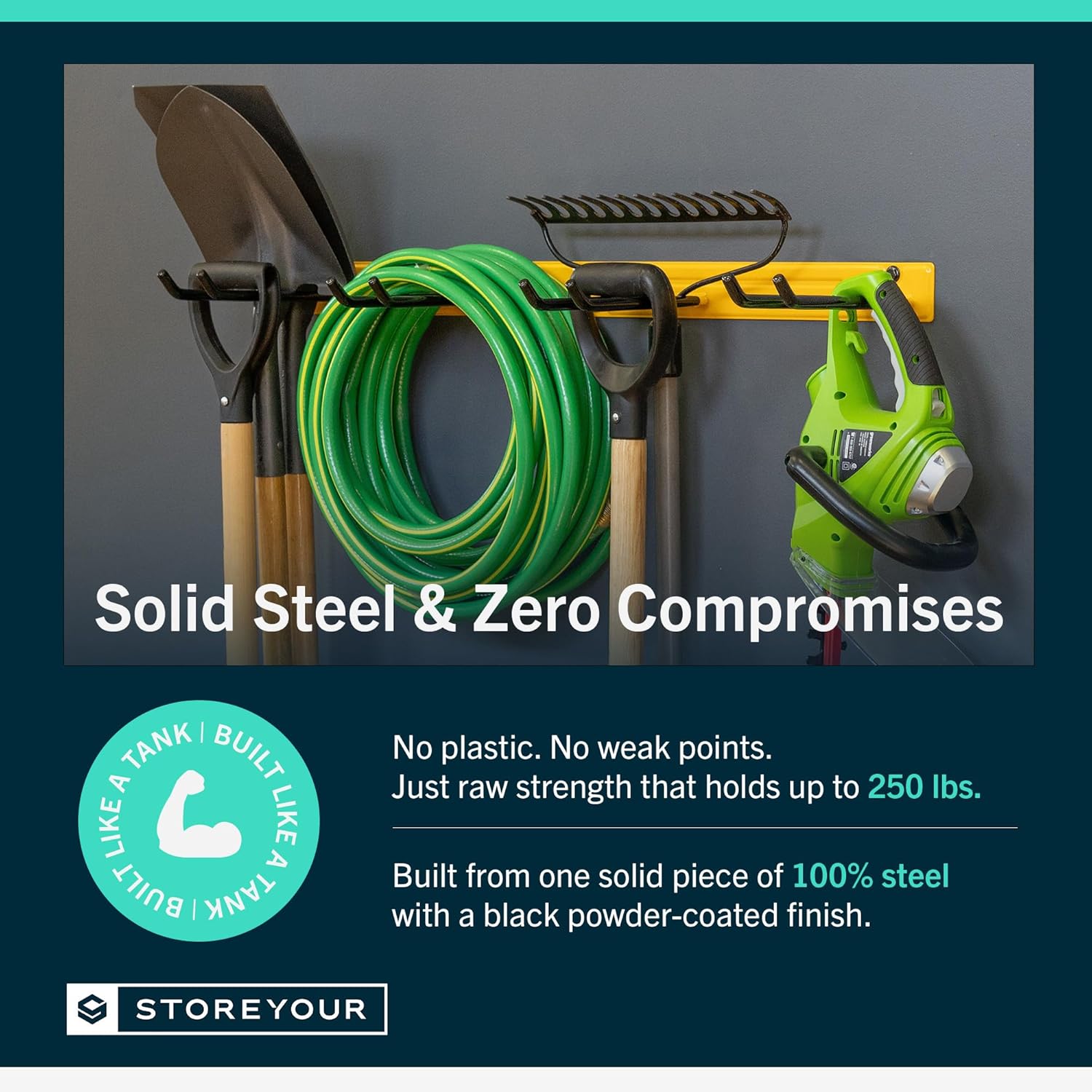 - ULTRA-STRONG & BUILT TO LAST – Made from 100% solid steel with no plastic parts or assembly required, this tool rack is crafted to withstand heavy-duty use. Each wall-mounted storage rack arrives fully welded and powder-coated to resist rust and corrosion. Perfect for organizing tools, outdoor storage gear, or even a fishing pole rack for the garage.