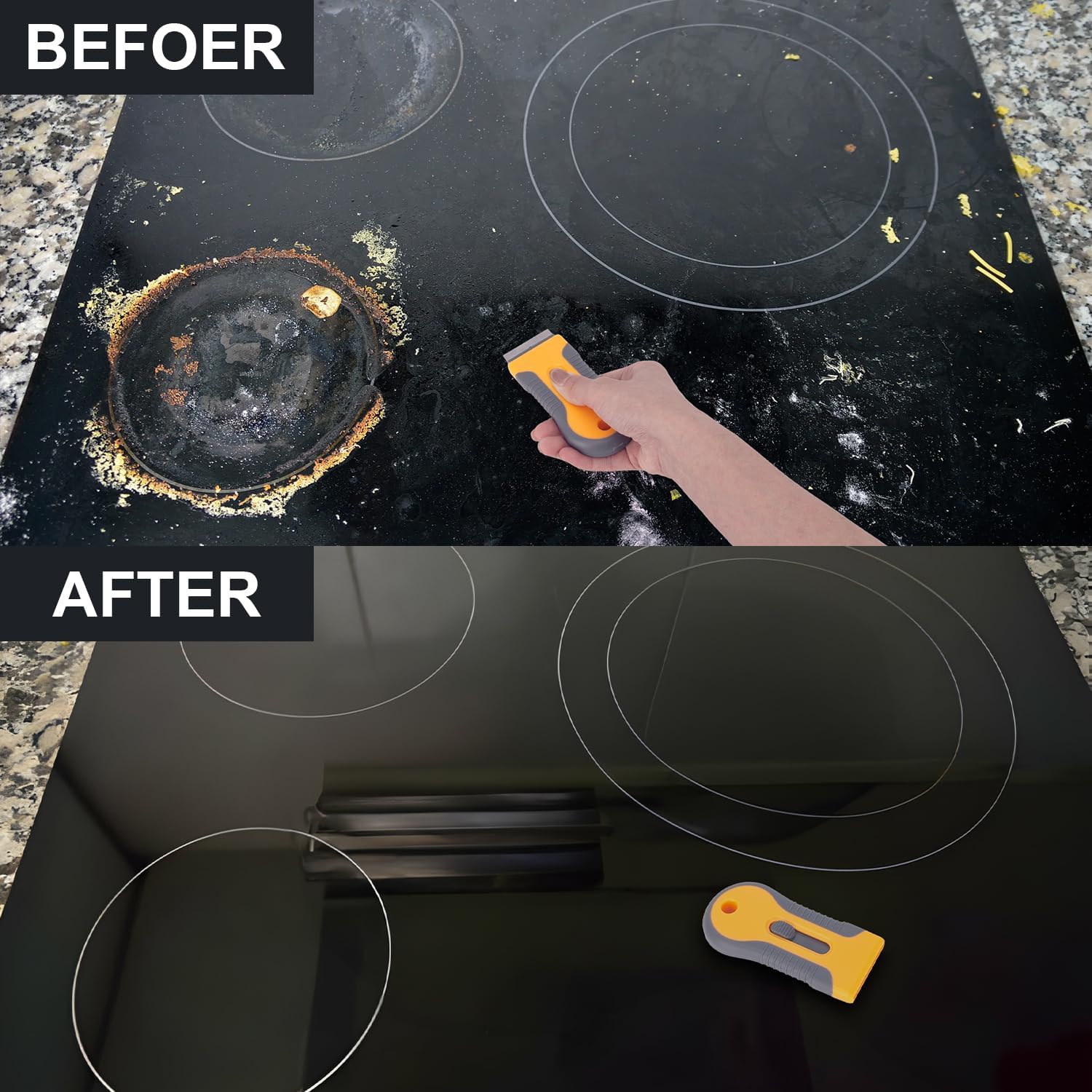 - 🌞【Multi-Surface Stove Scraper tool】Perfect for use on glass, ceramic, and induction stovetops and cooktops, and is great for removing burnt food and gunk, as well as scraping off in the bathroom. glass scraper is also effective for removing a variety of other materials, including window, shims, paints, stickers, coloring film residues, wallpaper, and borders around the house.