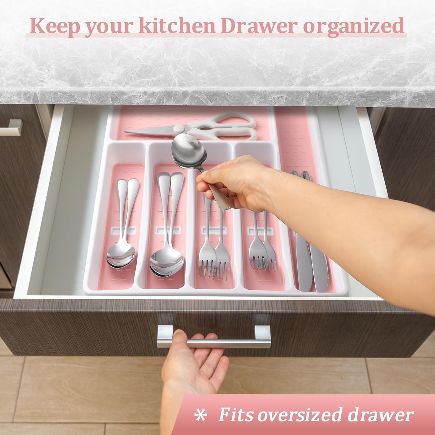 Silverware Organizer with Cutlery Icons,Pink Kitchen Silverware Tray for Drawer,Plastic Flatware Tableware Cultery Drawer Organizer Utensil Organizer with Non-slip TPR Linings,6-Compartment,Pink