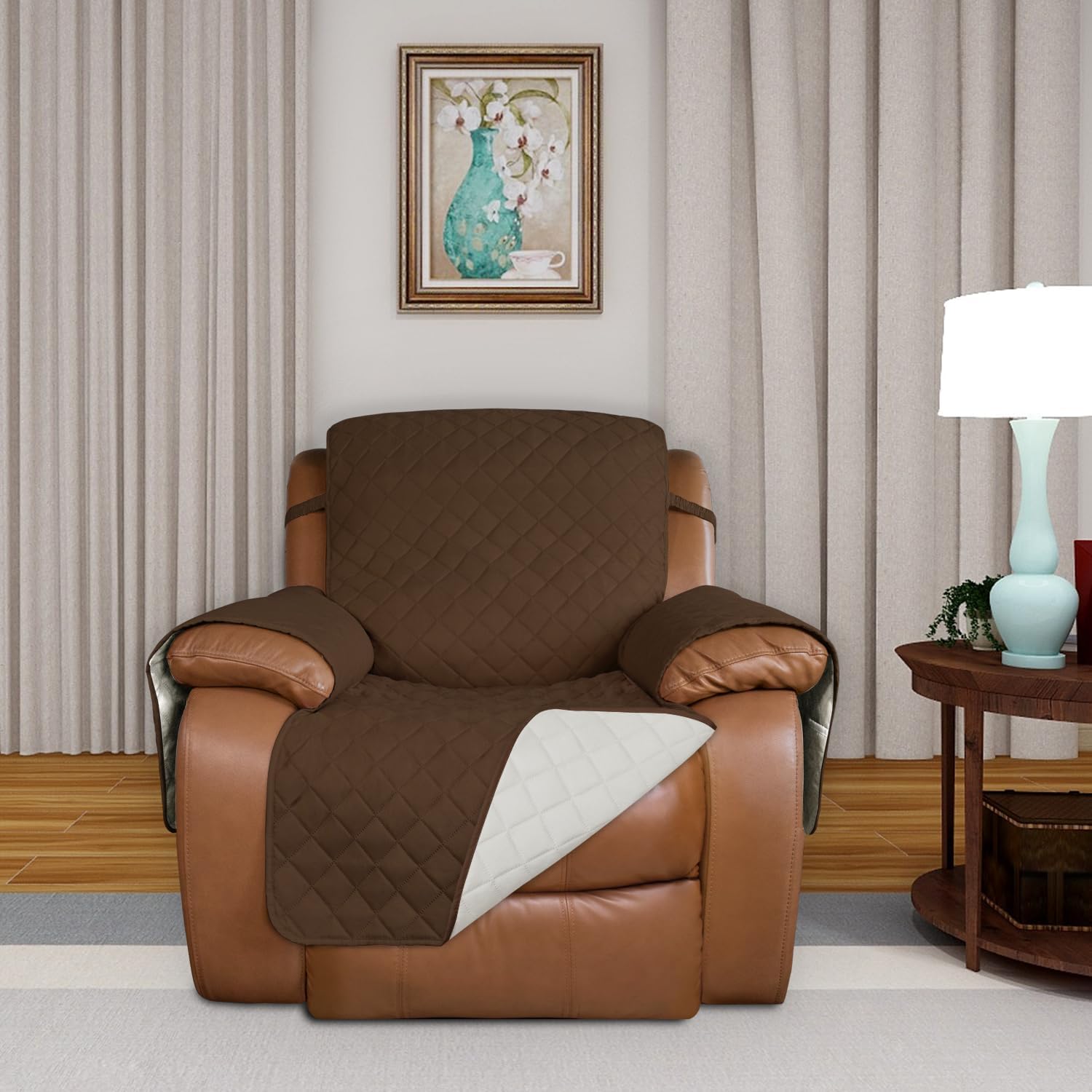 PureFit Reversible Quilted Sofa Cover, Water Resistant Furniture Protector, Washable Couch Cover with Non Slip and Elastic Straps for Kids, Dogs, Pets (Oversized Recliner, Coffee/Ivory)
