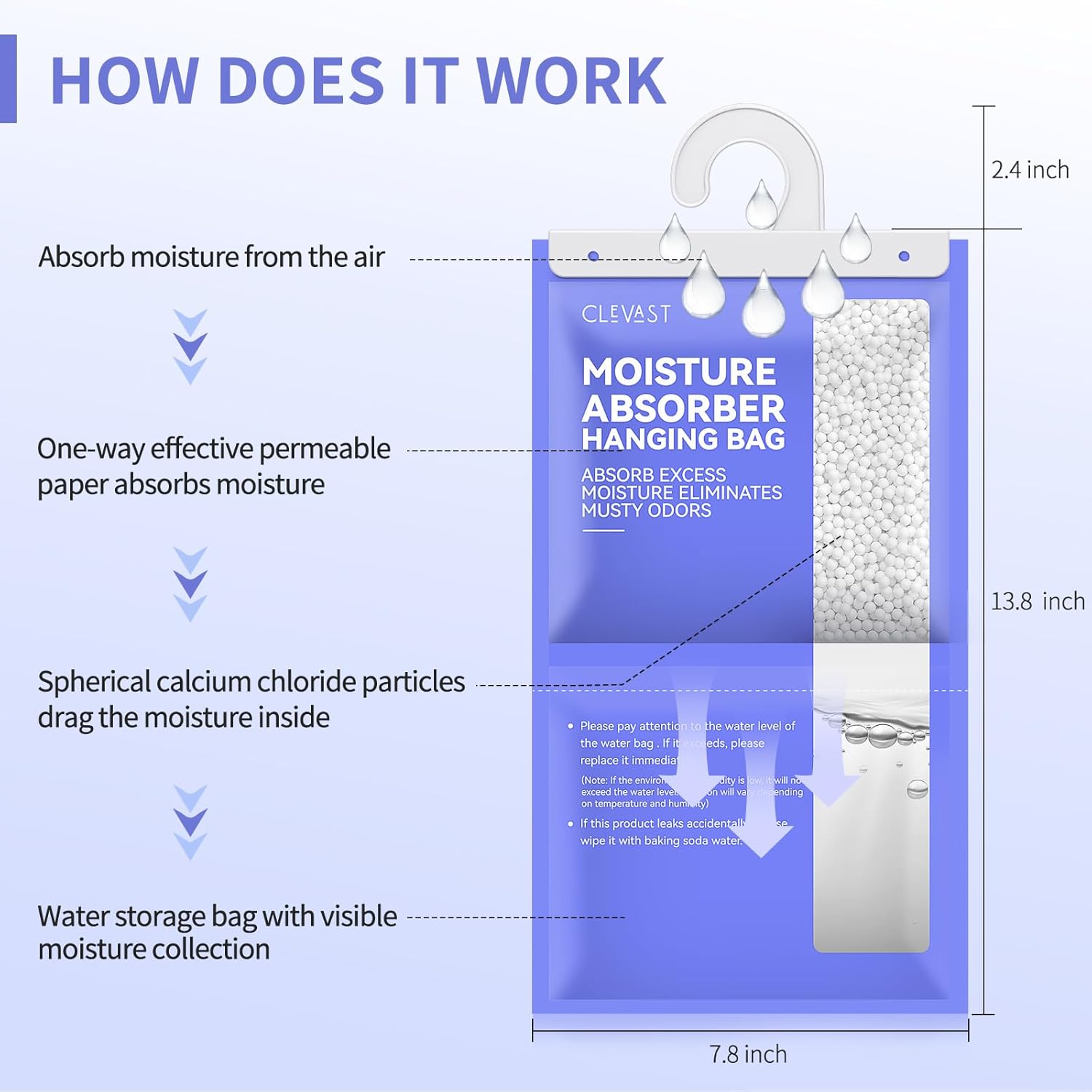 - EFFECTIVE DEHUMIDIFICATION: The CLEVAST dehumidifier bags feature spherical calcium chloride particles that can attract and absorb excess moisture quickly and efficiently. Moisture absorbers are designed with premium one-way moisture-permeable paper that will securely lock the moisture inside.