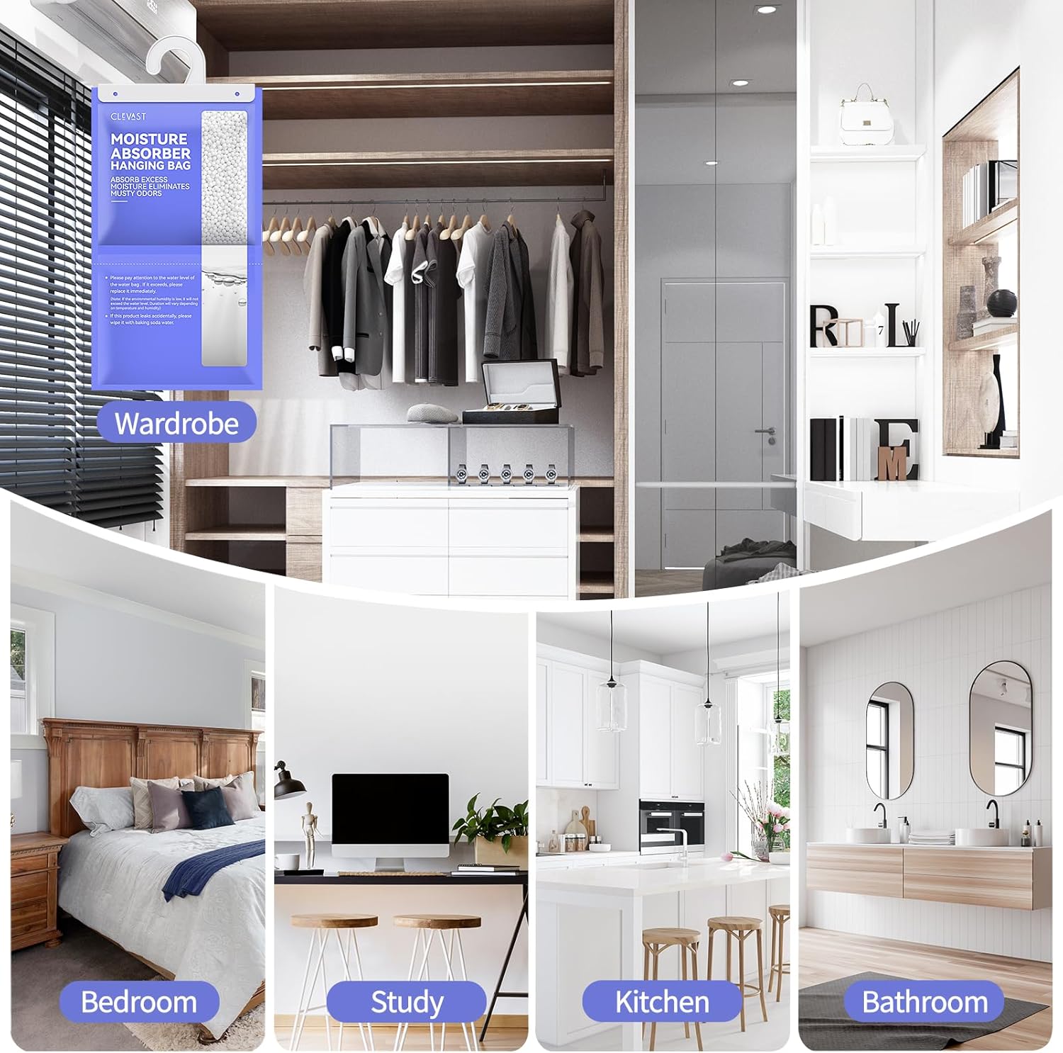 - EASY TO USE & STORAGE: No assembly is required. Each closet moisture absorber is stored in a separate bag for easy use and long-term storage. These can be hung anywhere for physical dehumidification. These dehumidifier bags feature an easy-to-hang hook, taking up just a little space in your room.