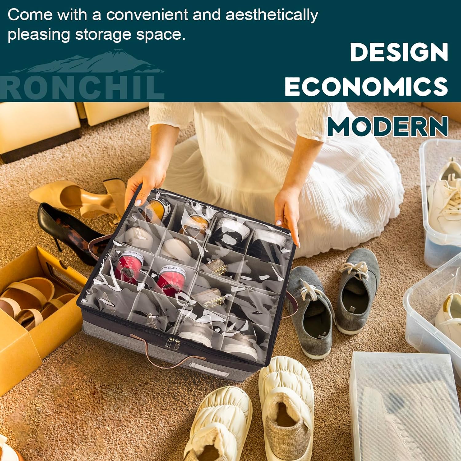 Shoe Organizer for Closet, Foldable Shoe Storage Bins with Clear Cover, Space Saving Shoes Holder with 4 Handles, Large Adjustable Shoe Box Storage Containers, Fits 8-16 Pairs, 1 Pack, Black