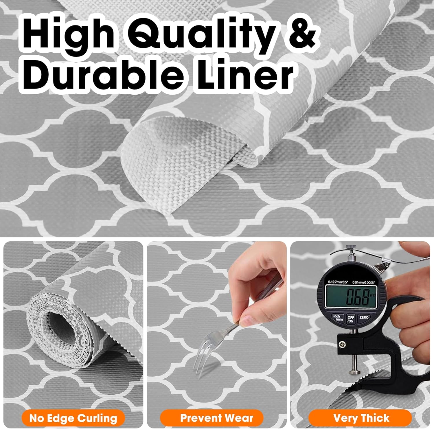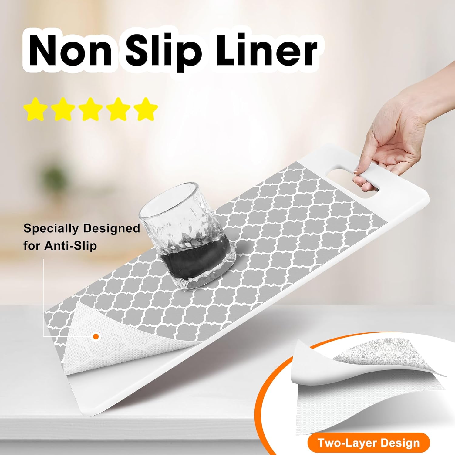 - Cabinet Liner【Non-Slip】: Cabinet liners for shelves surface uses a double-sided, non-slip design. It holds items in kitchen shelf, cabinets, drawers and shelves in place. The unique PVC material preventing slipping and curling at the edges