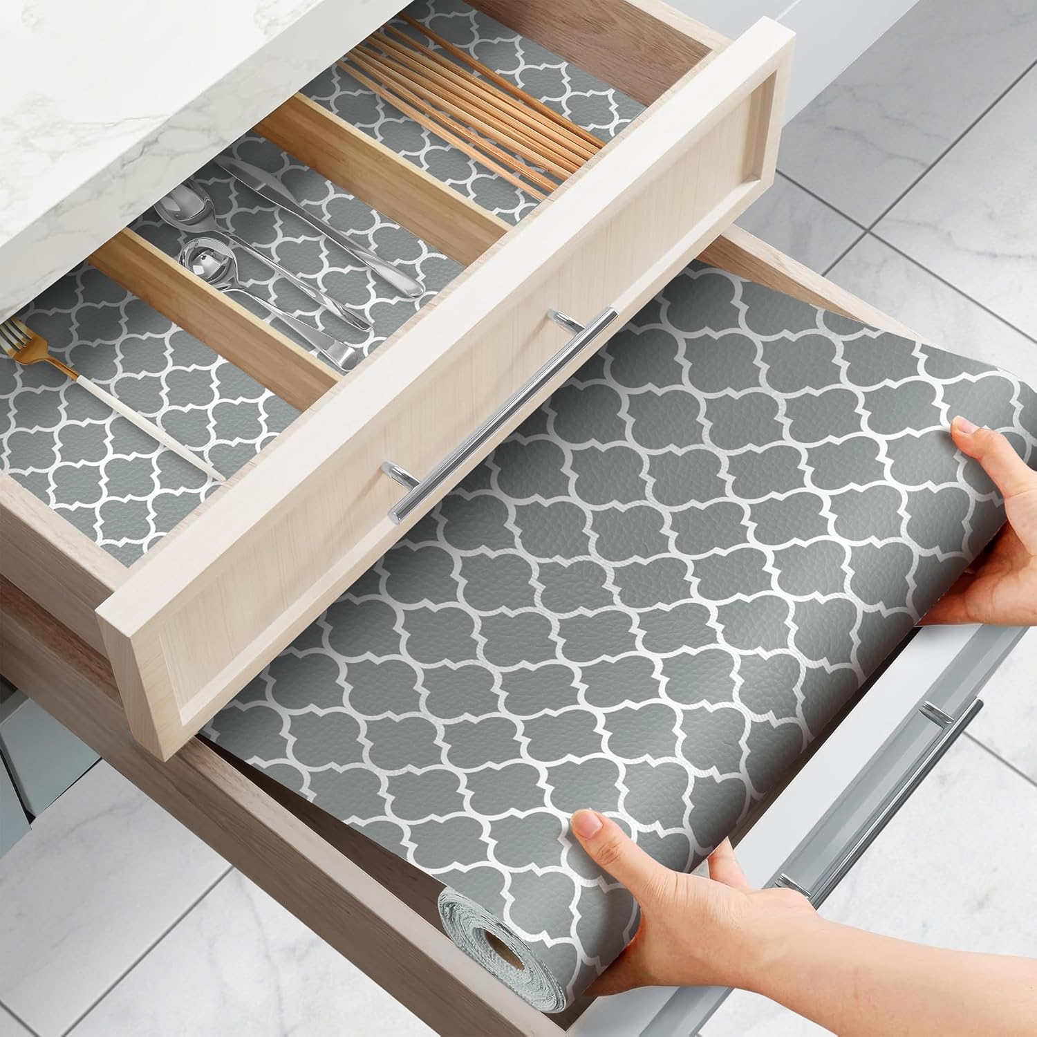 - Kitchen Drawer Liner【Easy to Use】: Enjoy a carefree space with our versatile kitchen shelf liner! Get creative and customize to fit your shelves and drawers. Non-adhesive design can be reused many times to avoid the damage caused by glue to the surface
