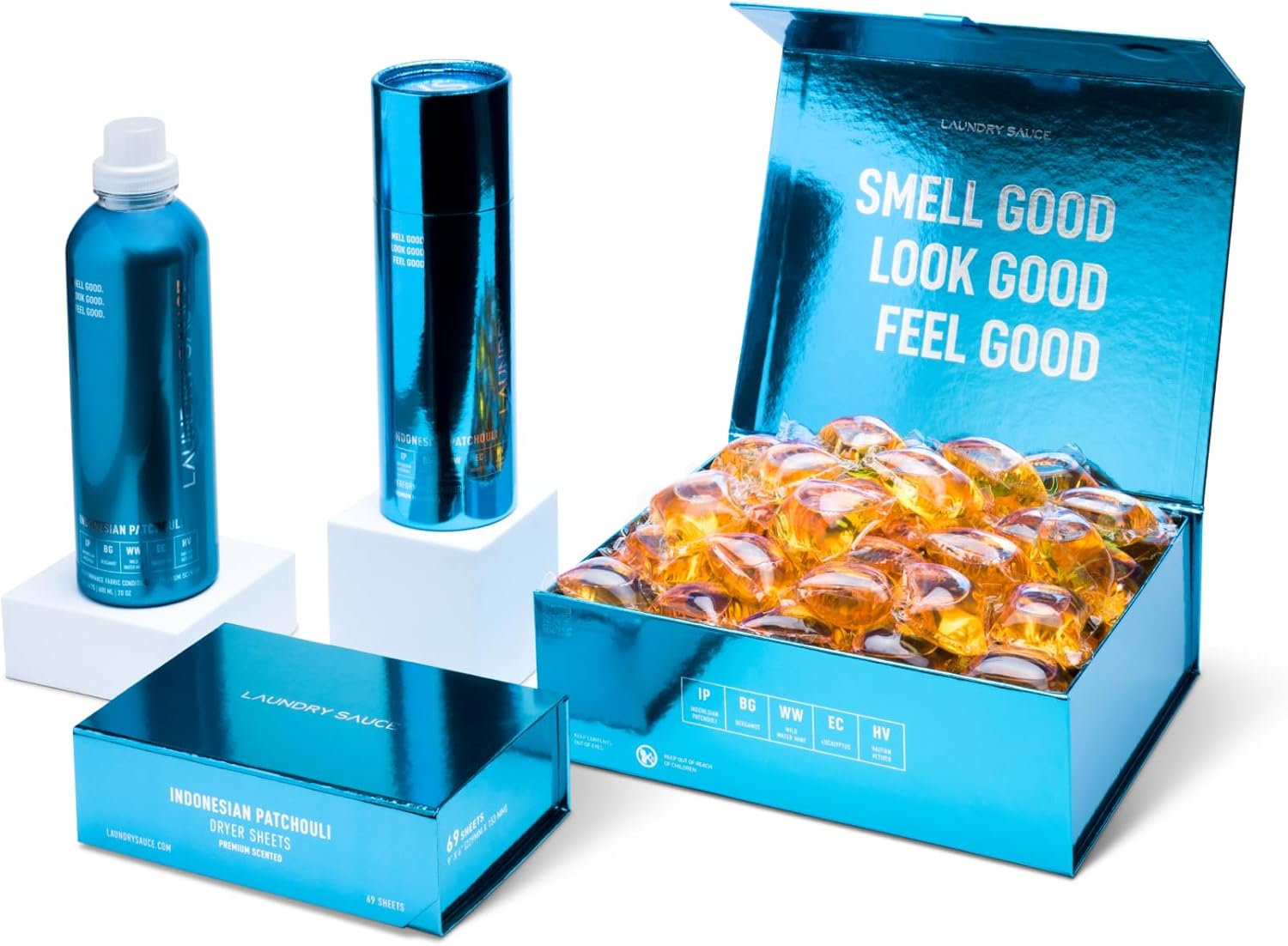 Laundry Sauce - Signature Bundle Indonesian Patchouli, Scented Laundry Detergent Pods & Scent Booster, Fabric Softener, Dryer Sheets, Fabric Protection, Essential Oils, Long Lasting Luxury Fragrance