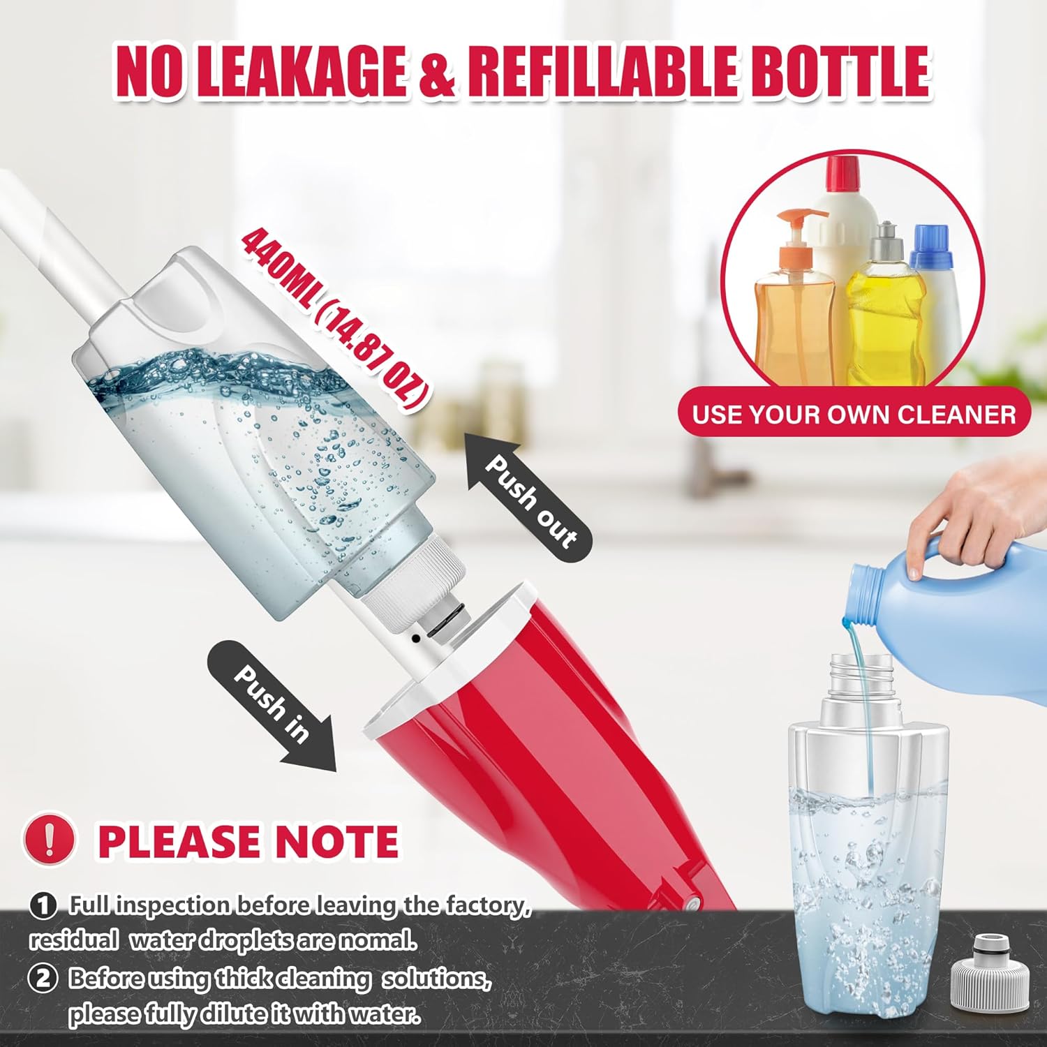 - {Warm Tips}:①Each spray mop has be spray function tested before sent, a small amount of water may remain in bottle is normal phenomenon.②Please clean the water tank and spray nozzle of the floor mop after use to keep it clean and protected.③Please don't fill boiling or impurity water, strong acid,alkali detergent into the bottle of the wet mop.