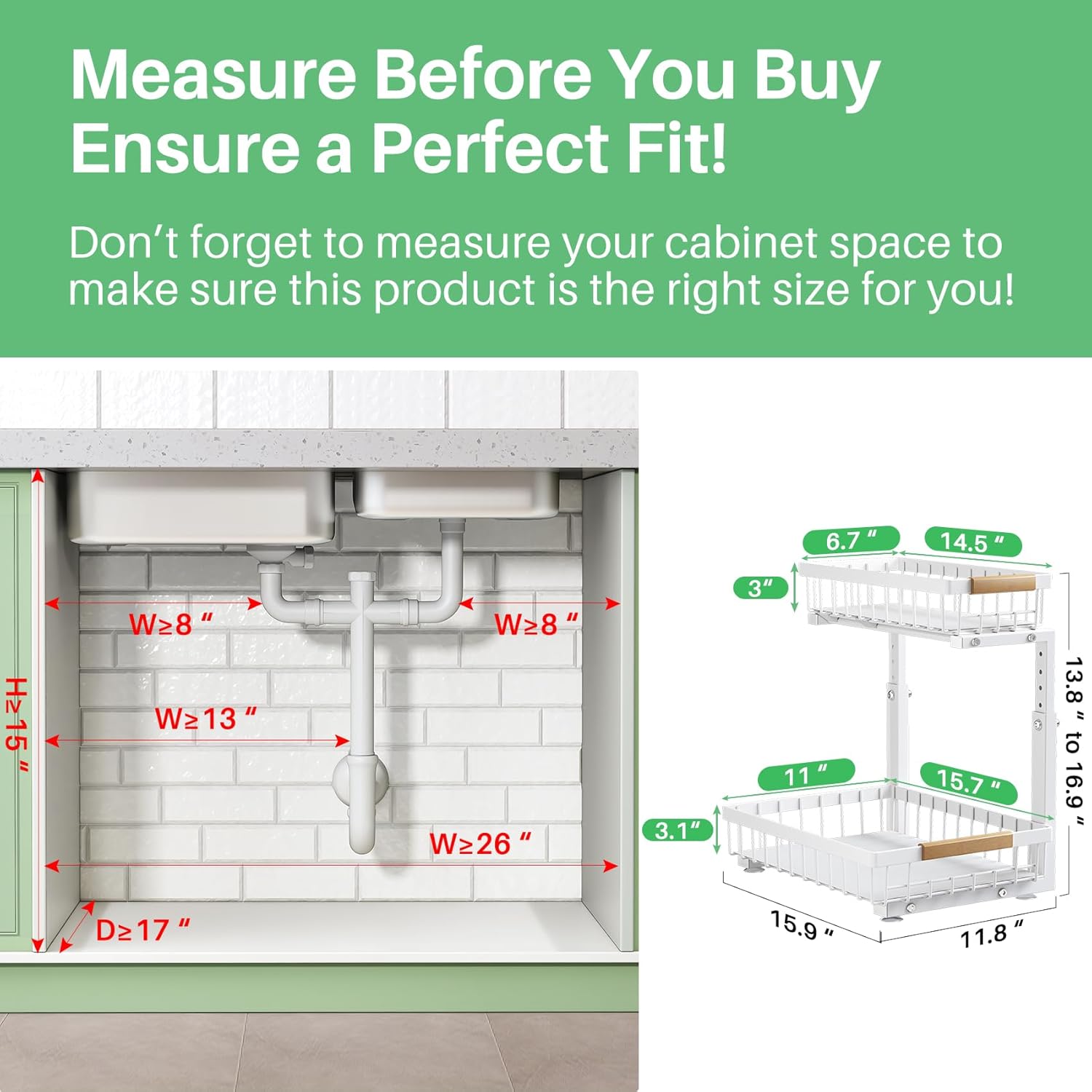 - Larger Organizer for Maximum Efficiency: This under sink organizer, measuring 11.8"W x 15.9"D x (13.8"-16.9")H, providing more capacity for storing taller bottles, cleaning supplies and other essentials.Before purchasing, please double-check your cabinet dimensions to ensure this under cabinet organizer fits properly.