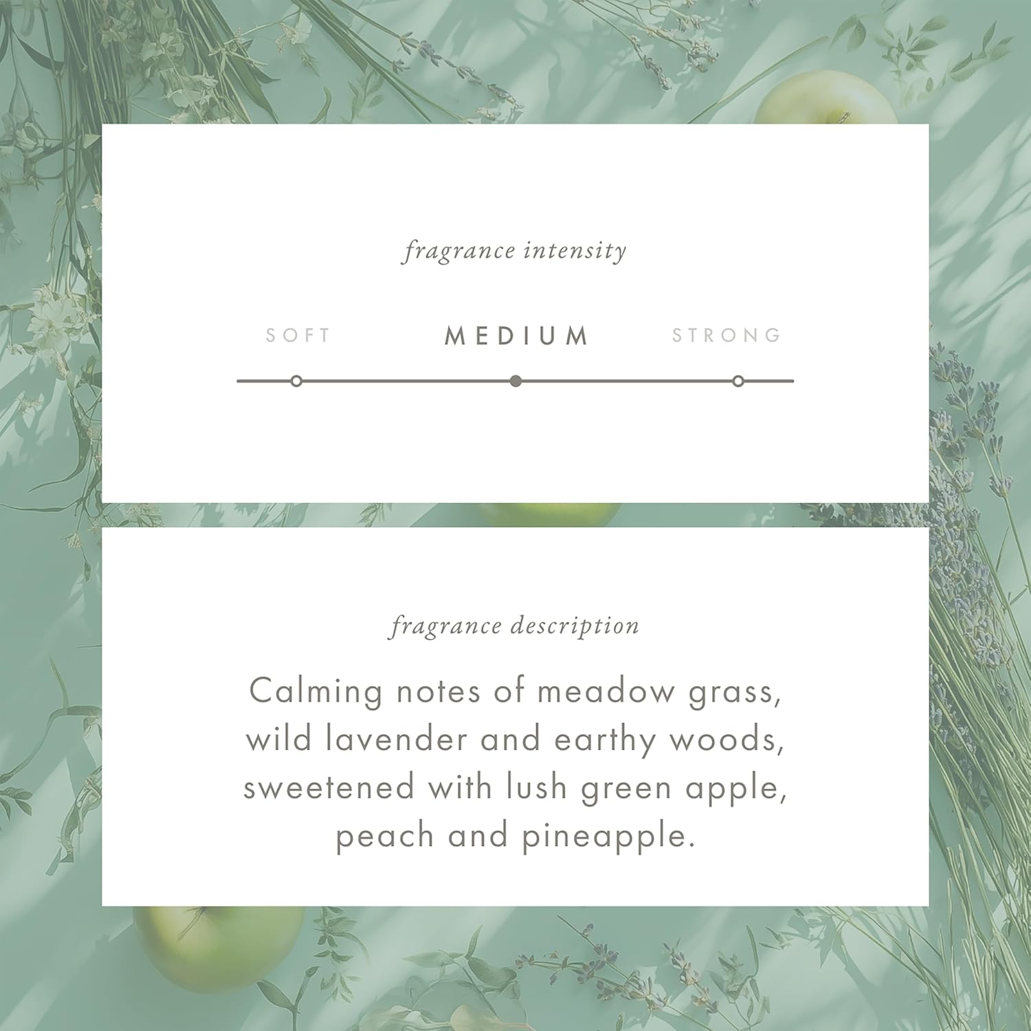- EMERALD MEADOWS: Calming notes of meadow grass, wild lavender, and earthy woods, sweetened with lush green apple, peach, and pineapple.