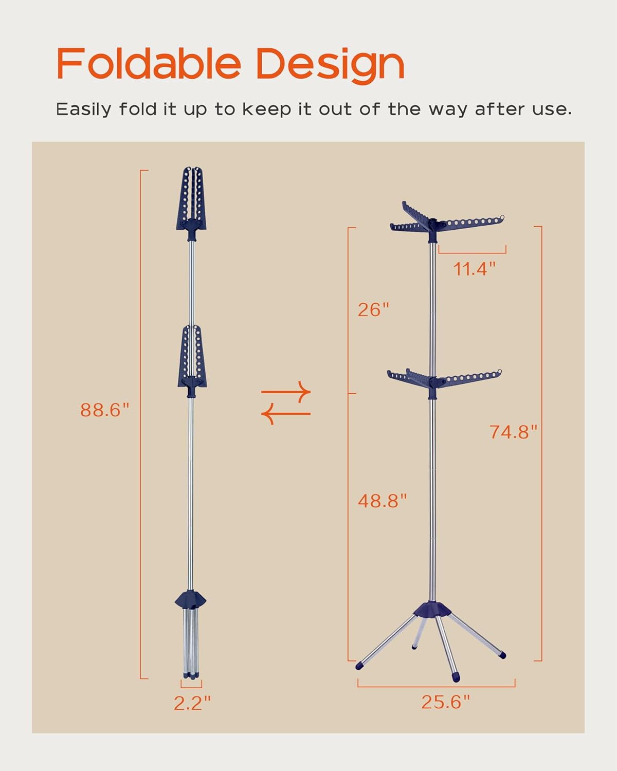 - [Foldable and Space-Saving] This vertical drying rack measures 25.6”D x 25.6”W x 74.8”H and takes up very little space. After use, simply fold the four legs and three drying rods into a smaller size: 2.2 "D x 2.2 "W x 88.6H, which can be leaned against the footrest, perfect for apartment laundry rooms or narrow spaces and corners.
