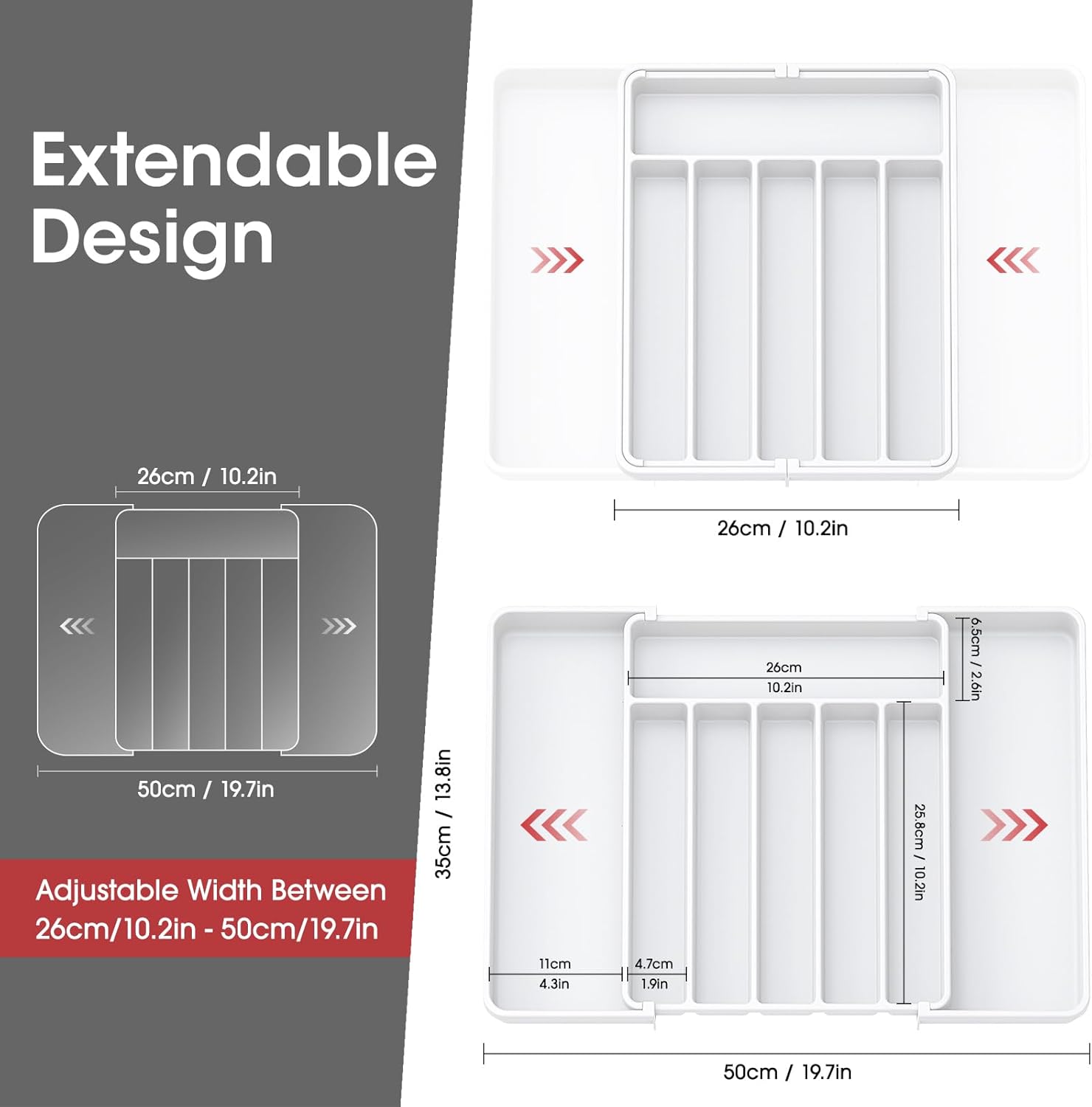 - ADJUSTABLE WIDTH: Tailor the AUJEN kitchen storage organizer to your specific needs with its ingenious retractable and removable design, making it an ideal fit for drawers of various sizes and shapes. This kitchen utensil organizer measures 10.2'' wide when folded while reaching 19.7'' when fully expanded.