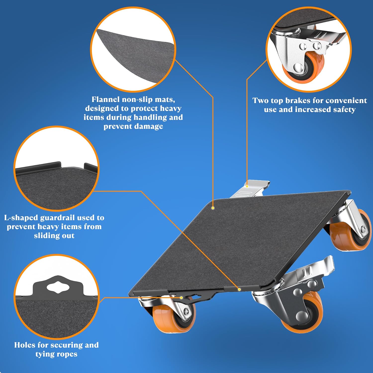 - ROBUST STRUCTURAL DESIGN, DURABLE CONSTRUCTION – The innovative layout of five omnidirectional wheels, including a central wheel for even weight distribution, significantly enhances the load-bearing capability. Each wheel features double-layer bearings, ensuring enhanced flexibility on various surfaces. An L-shaped fixed edge is incorporated to prevent slippage during the moving process. Additionally, each moving dolly is equipped with two wheels that have brakes, enabling effortless position locking when needed.