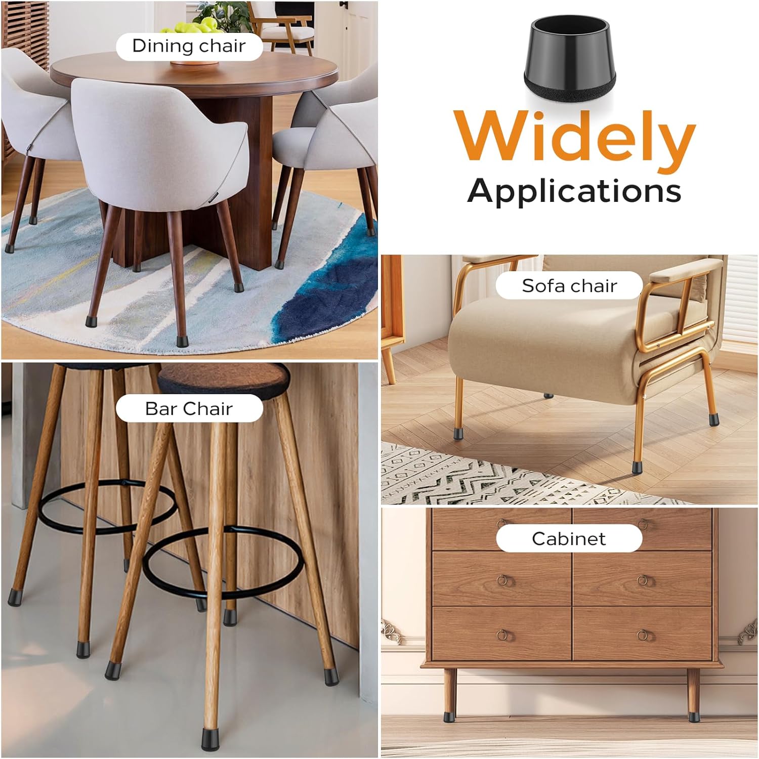 - Enhanced Felt & Wear Resistance- With a 360ยฐ fully enveloping felt bottom design and heightened felt thickness, engineered to accommodate various angles of slanted chair legs. Our chair leg floor protectors have a stretch, and elasticity which can maintain longer usage time.