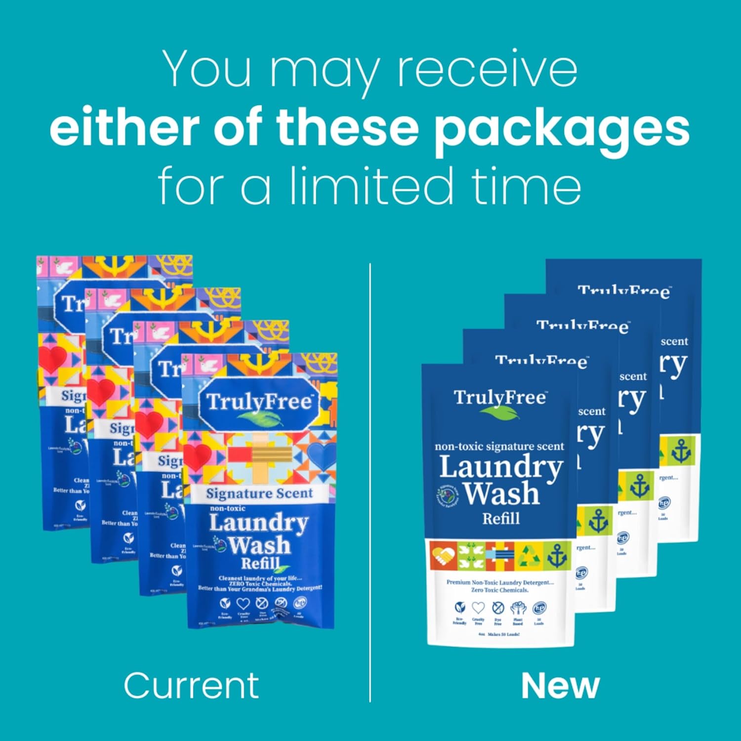 Truly Free Natural Laundry Detergent for Sensitive Skin | Eco Friendly, Plant Based, Baby Clothes Safe | Clean & Easy Powder to Liquid, 4 Pack Refill Detergent, NO Jug | Signature Scent, 200 Loads