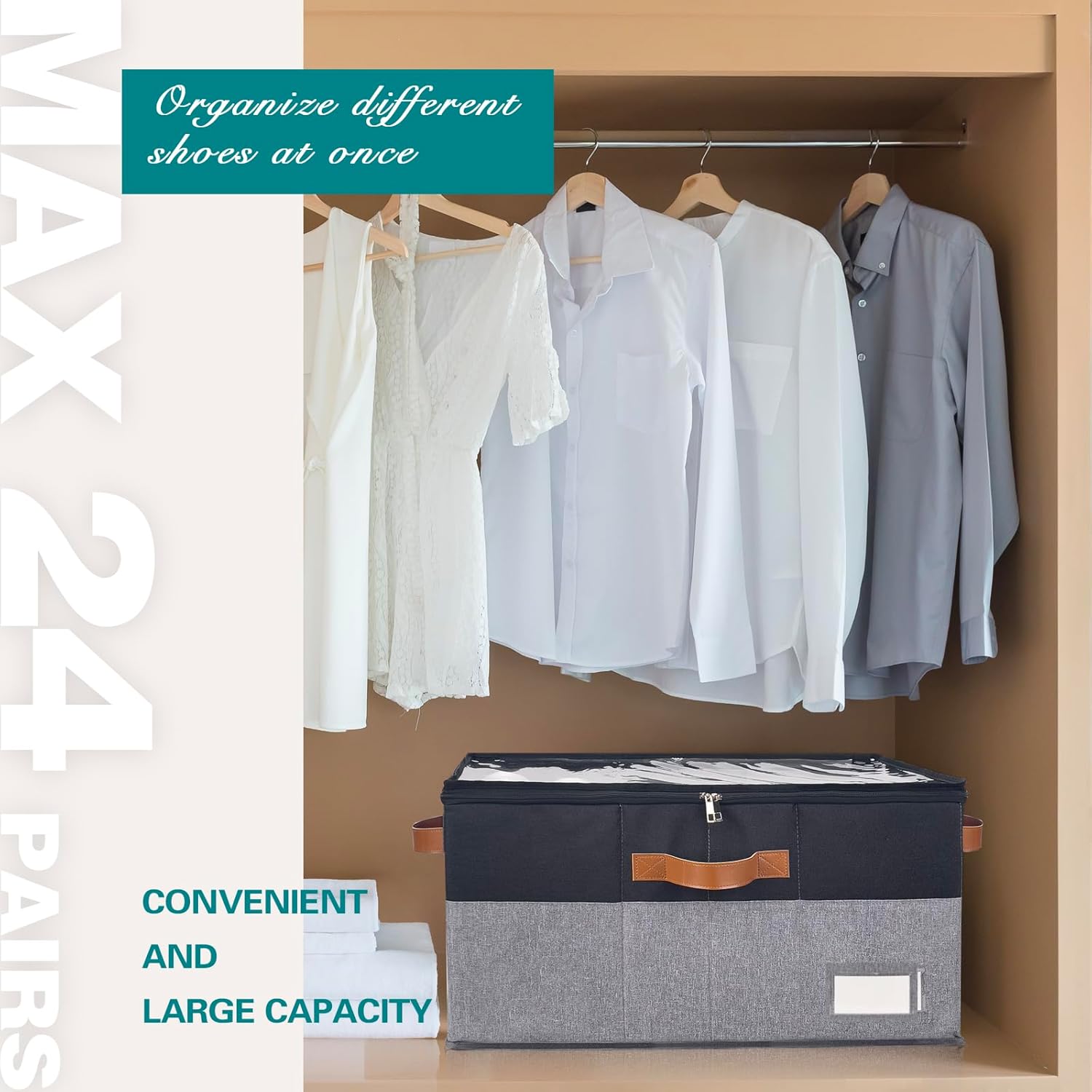 Shoe Organizer for Closet, Foldable Shoe Storage Bins with Clear Cover, Space Saving Shoes Holder with 4 Handles, Large Adjustable Shoe Box Storage Containers, Fits 12-24 Pairs, 2 Pack, Black