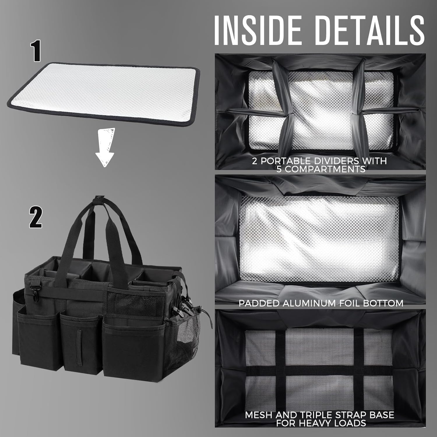 Wearable Cleaning Caddy Organizer with Handle & Shoulder Straps for Housekeepers, Under Sink & Car Cleaning Tool Organizer Bag with 4 Foldable Dividers (Black)