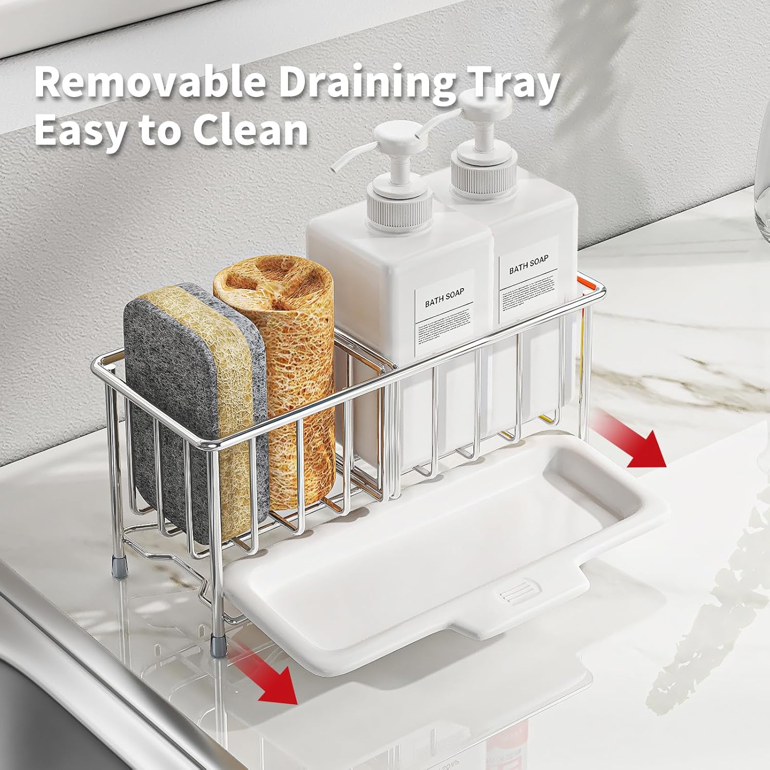Kitchen Sink Sponge Holder, 304 Stainless Steel Soap Dispenser Caddy Organize, Kitchen Sink Brush Caddy Holder with Removable Drain Tray