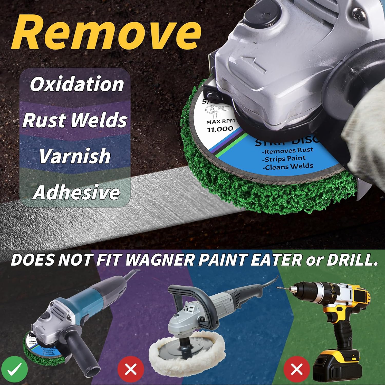 - Stripping Wheels Size: The sanding disc has a diameter of 4 inches(100mm), a thickness of 3/5 inches(15.24mm), and a bore size of 5/8 inches(16mm). Our grinder paint disc is a 4 inch x 5/8 inch spindle cleaning and stripping disc, with a maximum rotation speed of 11100 (R.P.M). It is not suitable for Wagner paint machine or drilling machine. To ensure your shopping pleasure, please make sure that your grinder is compatible with the spindle size of our products before buying.