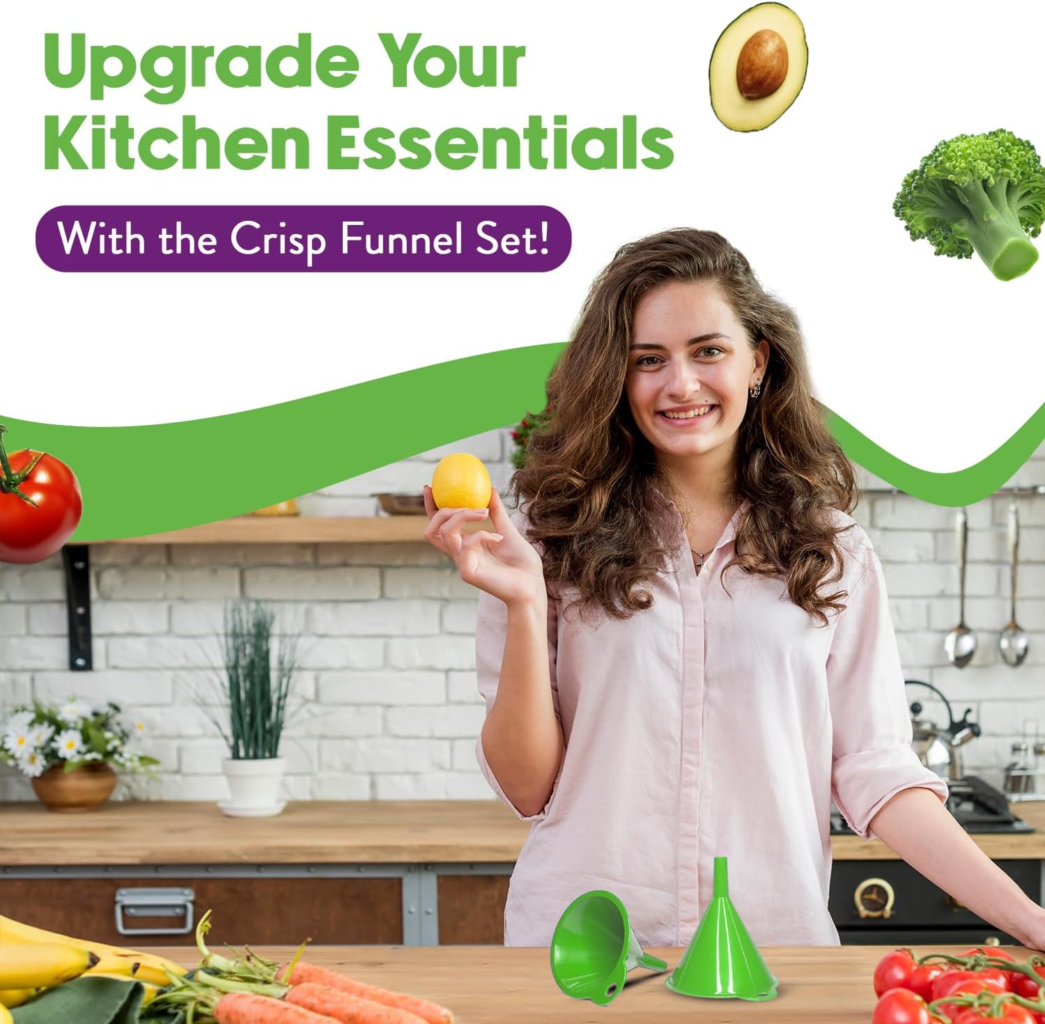 Crisp 2-Piece Funnel Set - All Purpose Funnels for Kitchen Use Filling Bottles - Durable & Dishwasher Safe Kitchen Funnel Set - Made in The USA - Bright Green