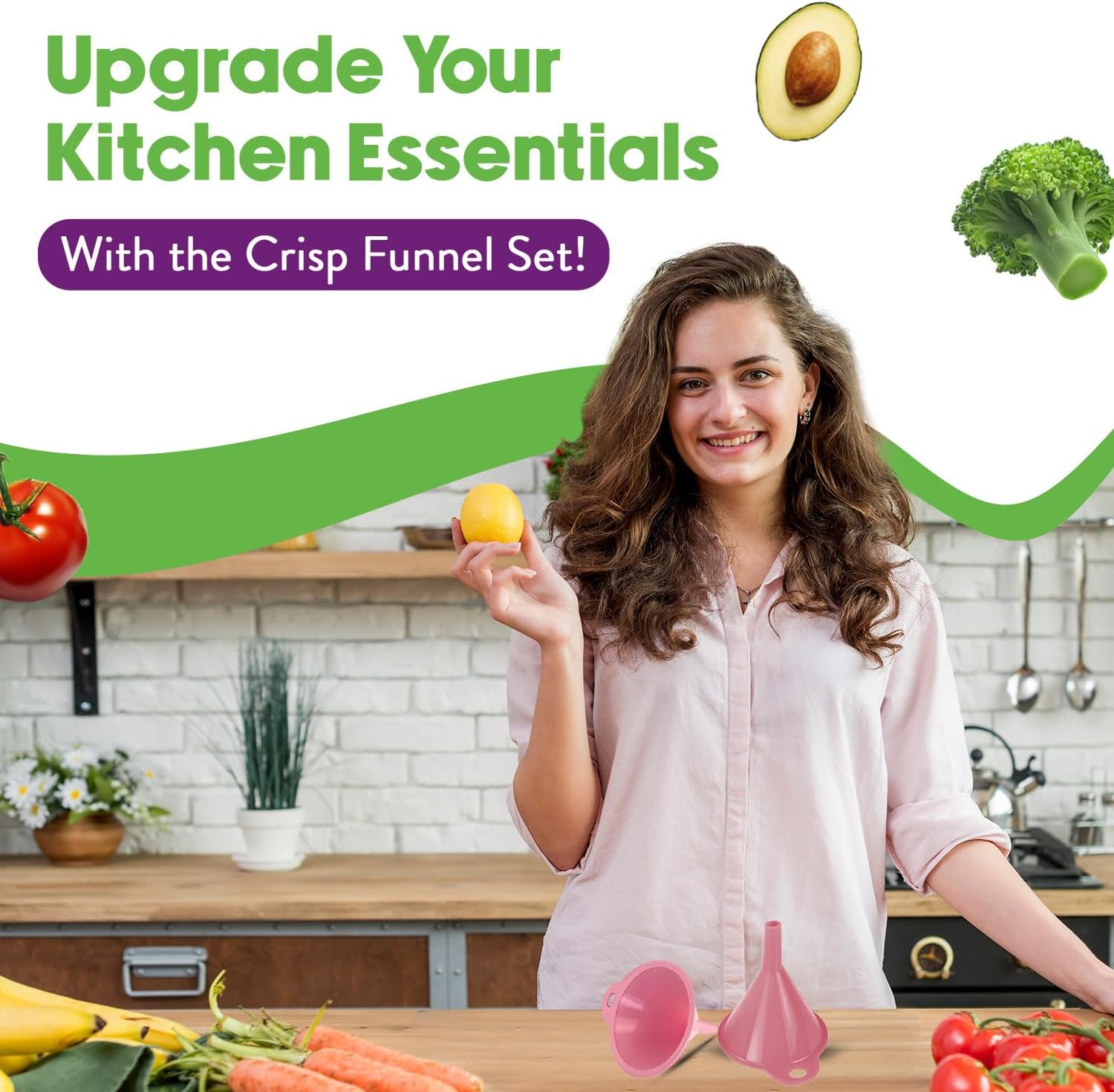 Crisp 2-Piece Funnel Set - All Purpose Funnels for Kitchen Use Filling Bottles - Durable & Dishwasher Safe Kitchen Funnel Set - Made in The USA - Pink