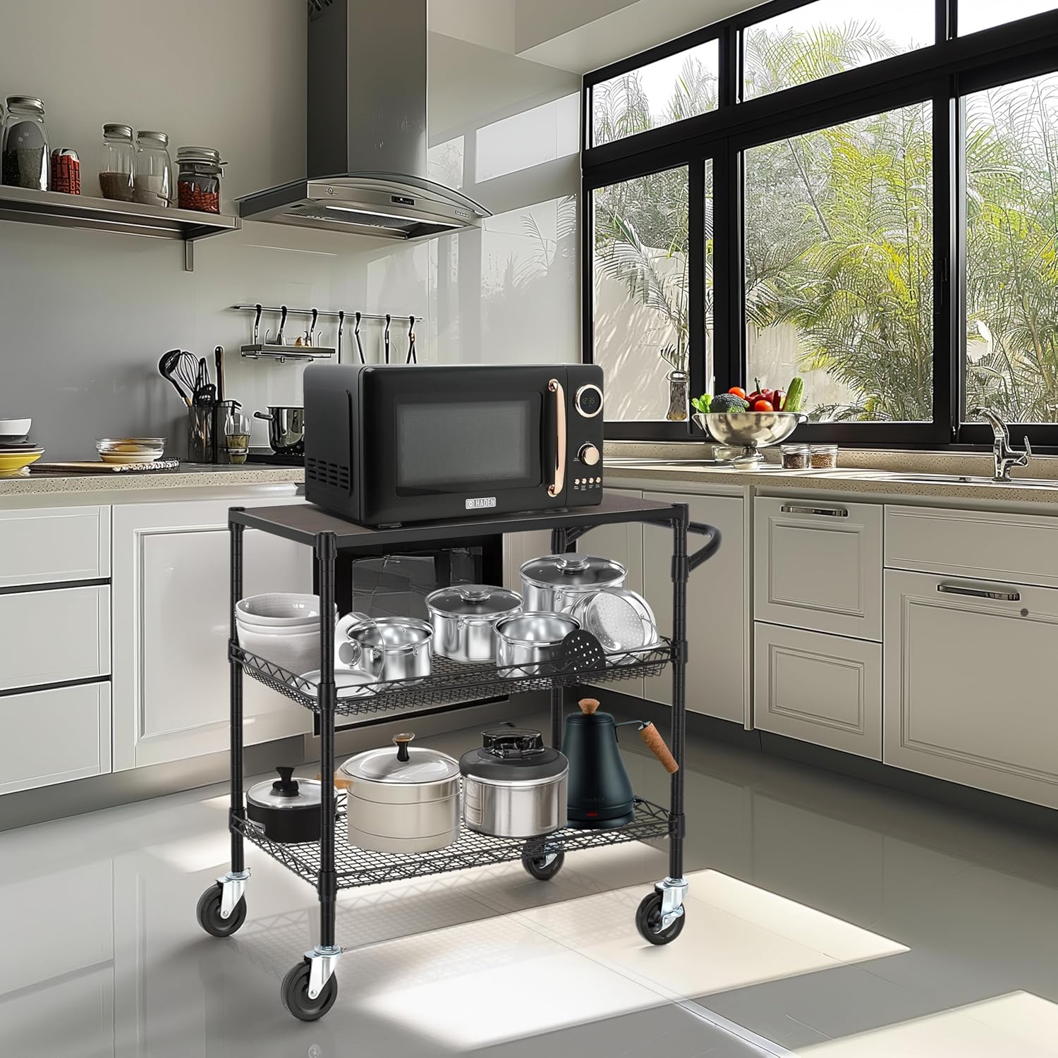- MUTI-FUNCTIONAL - 3 Shelves unit on 4 inches industrial wheels (2 with brake) to hold and move many small and large appliances. Ideal for using in kitchens, warehouses, garages, offices and restaurants, simplified the transporting of heavy and bulky loads. This mobile cart comes with a convenient handle push-bar and a ventilated basket. The shelves can be adjusted at one-inch intervals.