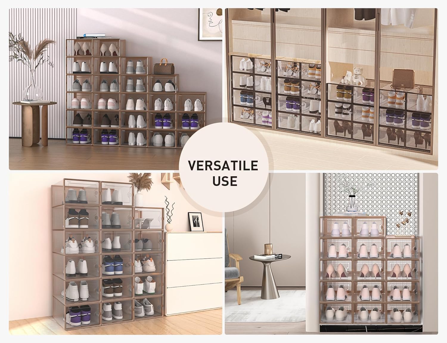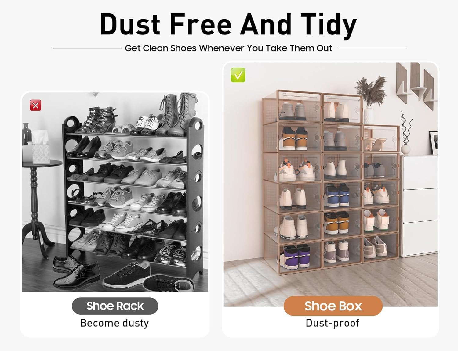 Kuject X-Large Shoe Storage Boxes Organizers for Closet 12 Pack, Fit Size 11,Clear Plastic Stackable Sneaker Containers for Entryway, Space Saving Shoe Rack,Substitute for Drawer Organize Unit, Brown