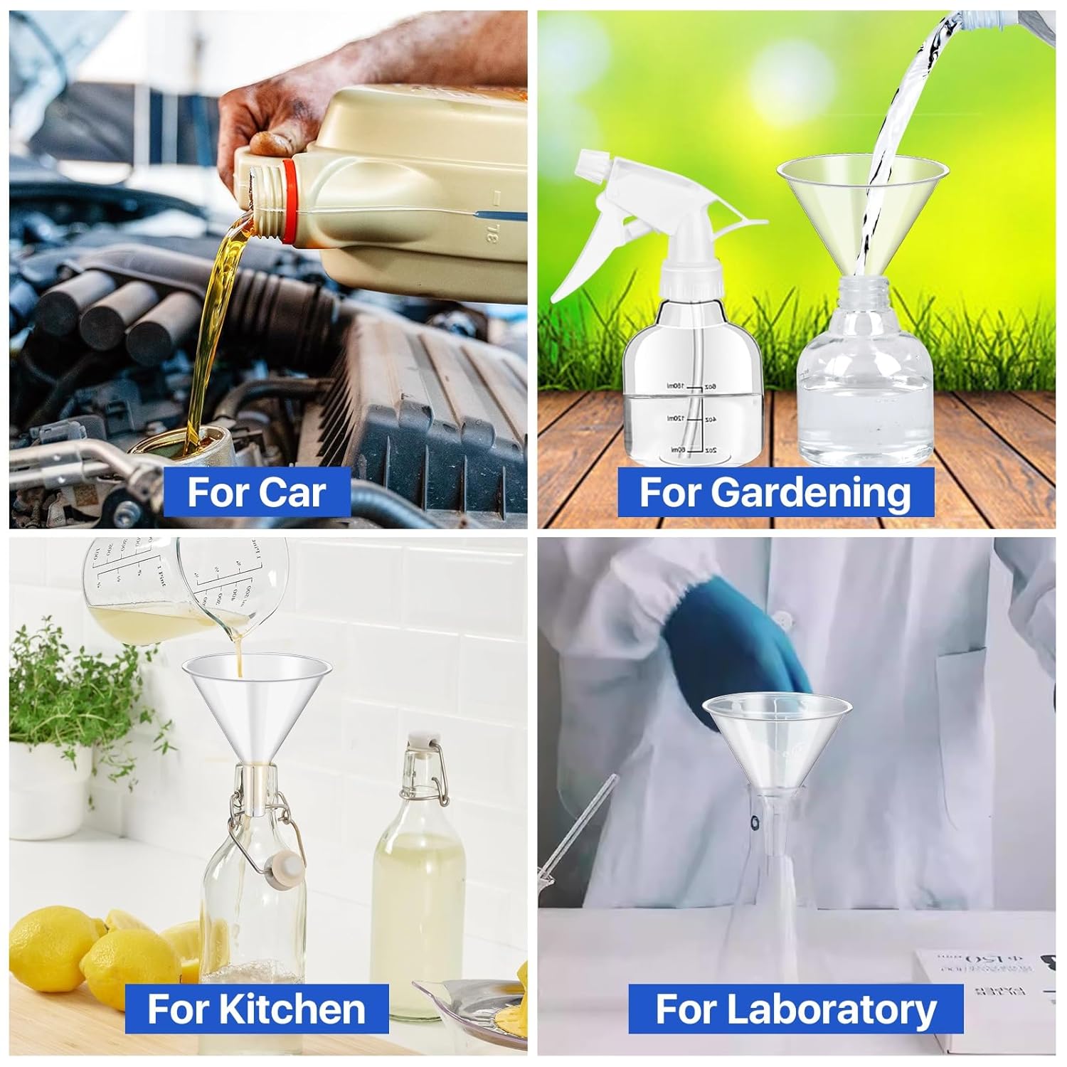 - WIDE APPLICATION - The funnels for filling bottles can be widely used for transferring water, juice, detergent, dry grits, perfumes, essential oils, sand paint, lotions, spices; perfect for home, kitchen, travel, studio, school and lab use