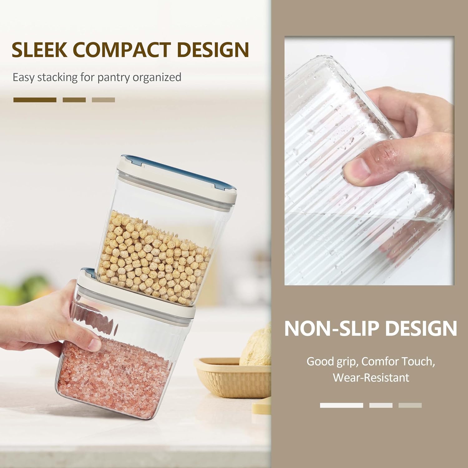 - Elegant Design and Practicality: With a sleek white and blue color scheme, these PET canisters add a touch of elegance to your kitchen decor. The clear body allows for easy monitoring of contents, while the anti-slip vertical striped surface adding grip for easy handling and storage