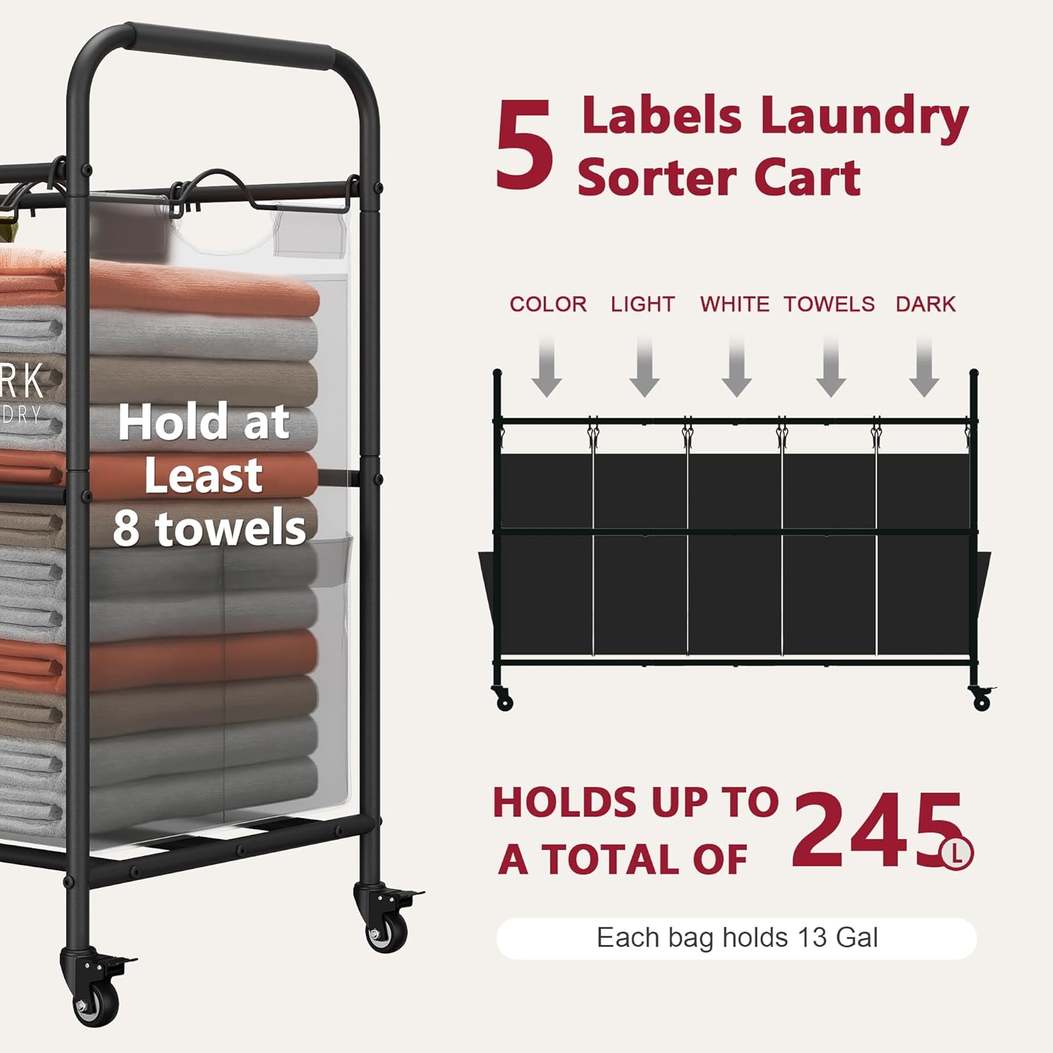 - 5 Removable Bags: The rolling laundry sorter comes with 5 separate laundry bags to sort your clothes by color or type. Simply use the two metal handles to remove the laundry bags individually from the laundry sorter.