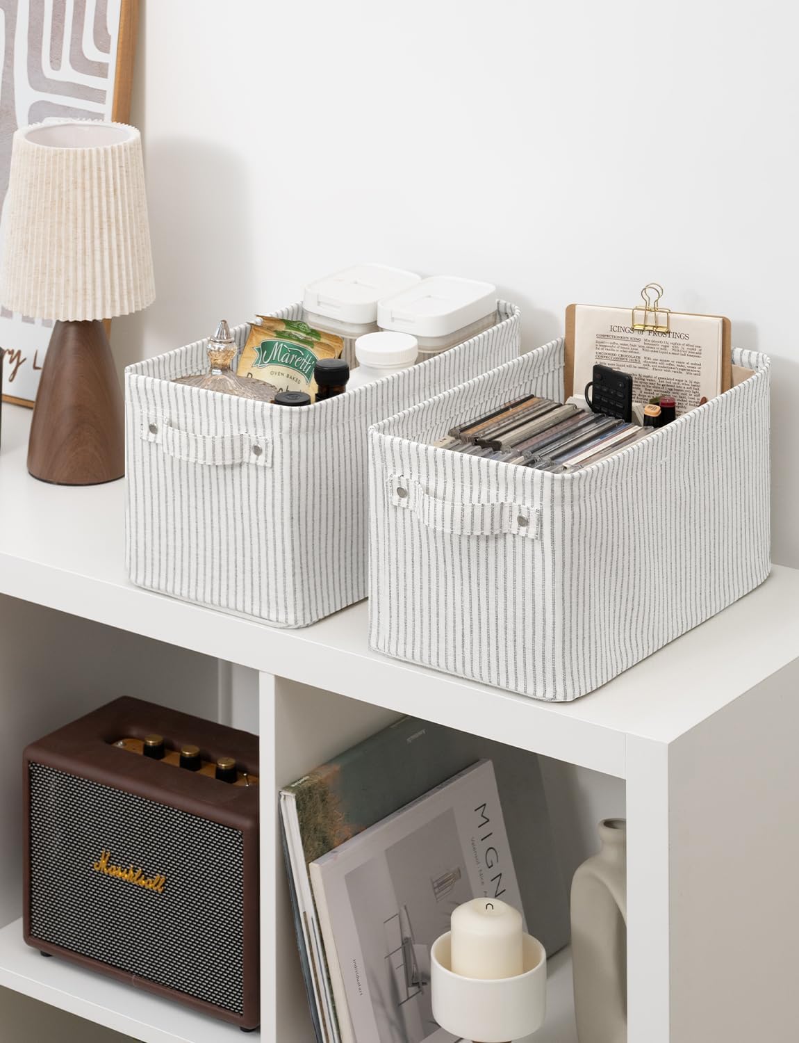 StorageWorks Narrow Storage Bins, Small Basket for Closet and Shelves, Rectangular Fabric Organizer with Handles, Toilet Paper Storage, Khaki and Beige Stripes, 2-Pack