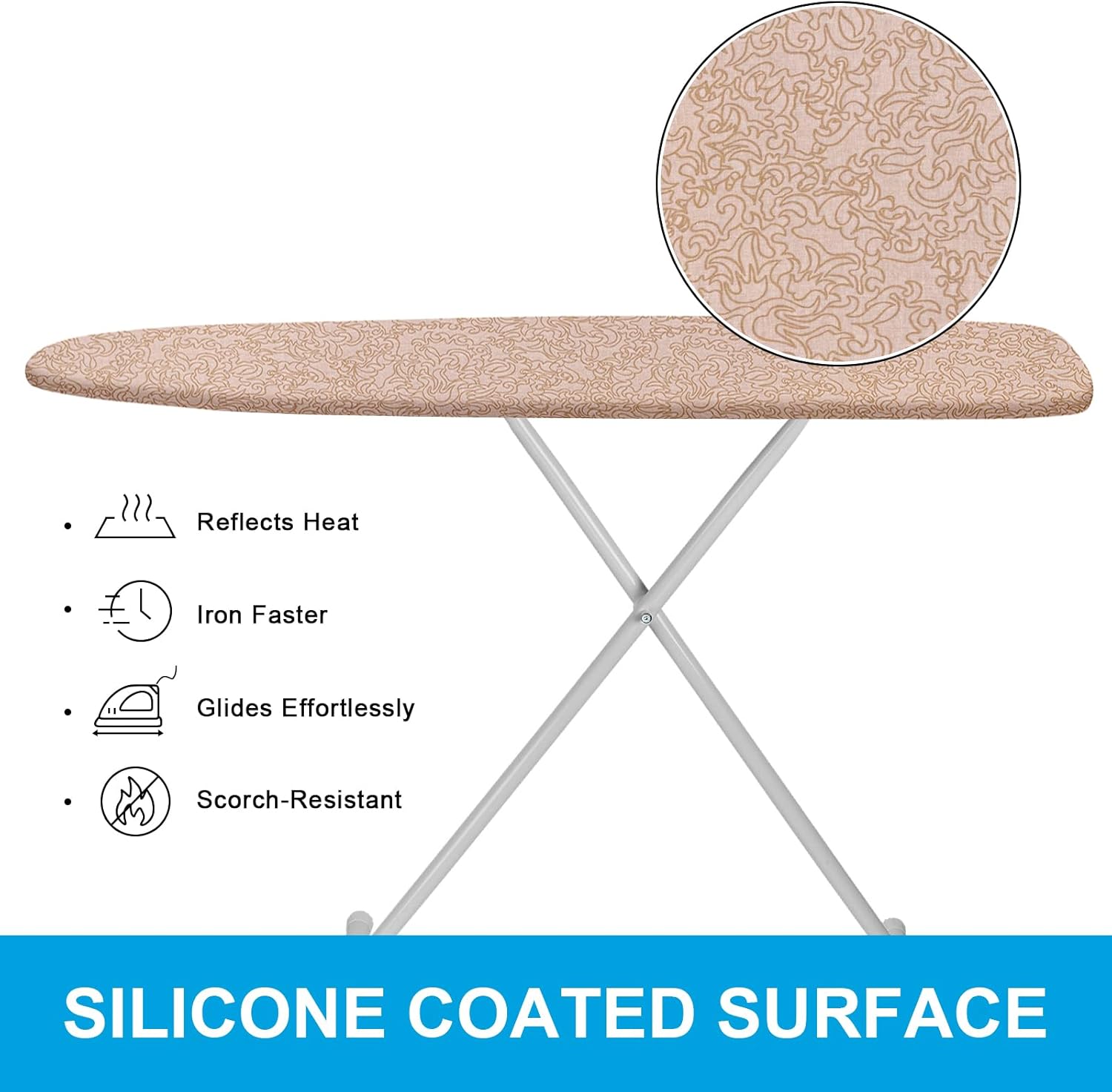 - THE SECRET OF FASTER AND EASIER IRONING - Premium elastic edge of the ironing board cover tailored firmly secure the ironing cover all-round for tightly fit. Guarantee Not easy to MOVE or SLIP. 4 sets of elastic fasteners(optional) pull the cover surface tight and straight with tension straps for universal fit. You will be surprised that the ironing works becomes smoother and better than normal. Make sure you faster and easier ironing and save your time on ironing chores