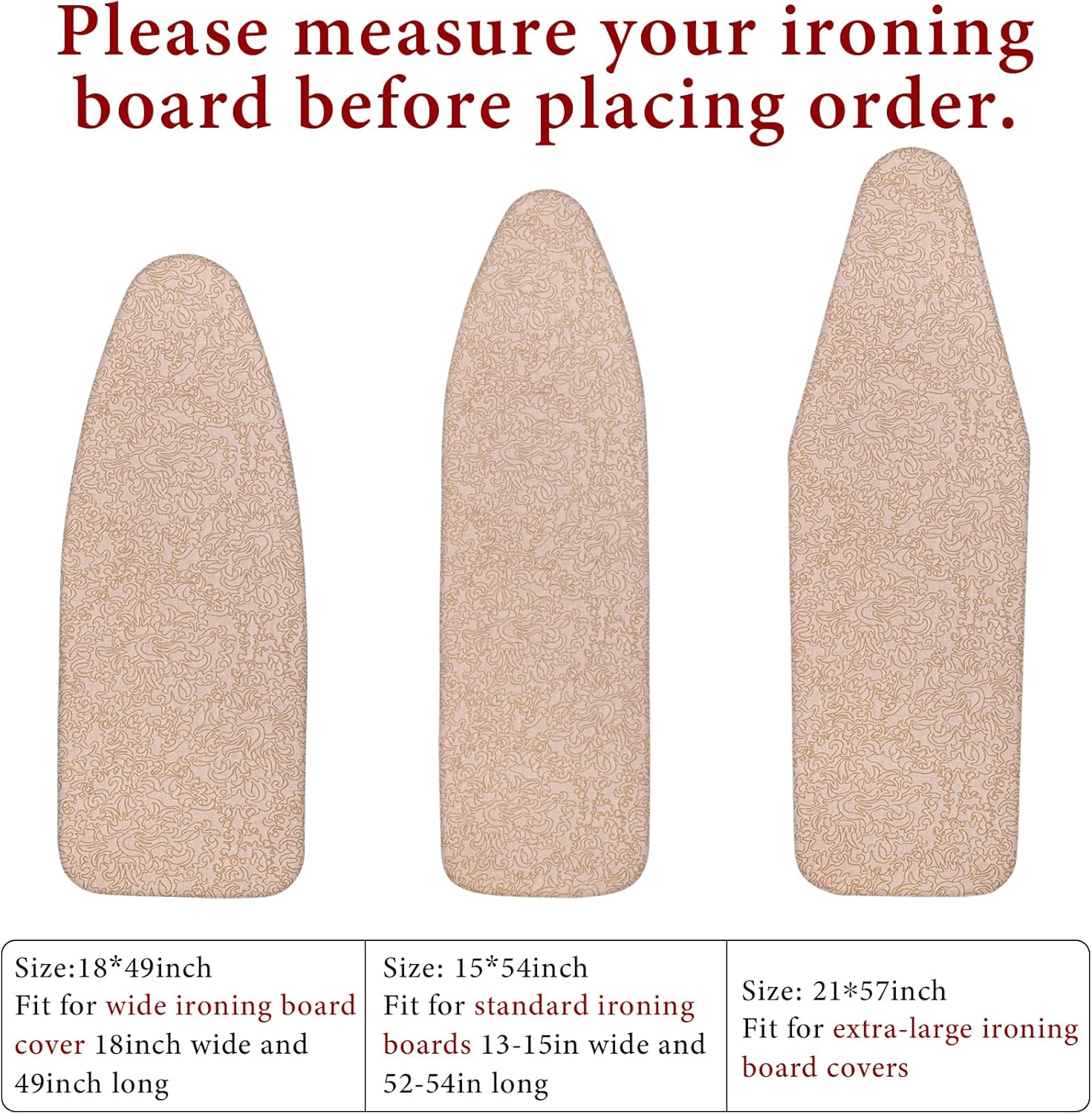 - PREMIUM FINE QUALITY MATERIAL -[READ BEFORE ORDER: Ironing board covers vary by size .Please make sure you choose correct size that matches your ironing board before placing order. ] Adopt high quality and durable 100% cotton with scorch and stain resistant finish as COVER. Comes with protective mesh cloth to avoid shining marks or scorches. More durable and heavy duty. Washing Tips: WIPE CLEAN ONLY