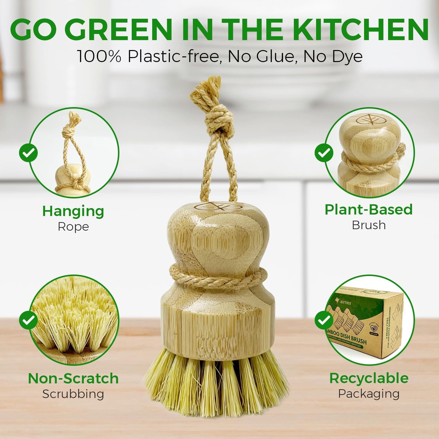 - NATURAL BAMBOO BRUSH FOR DISHES - Make an eco-conscious choice with an AIRNEX wooden brush for dishes. Its sturdy bamboo head & high-density sisal and coconut bristles can outlast regular kitchen brushes for cleaning, without getting stinky.