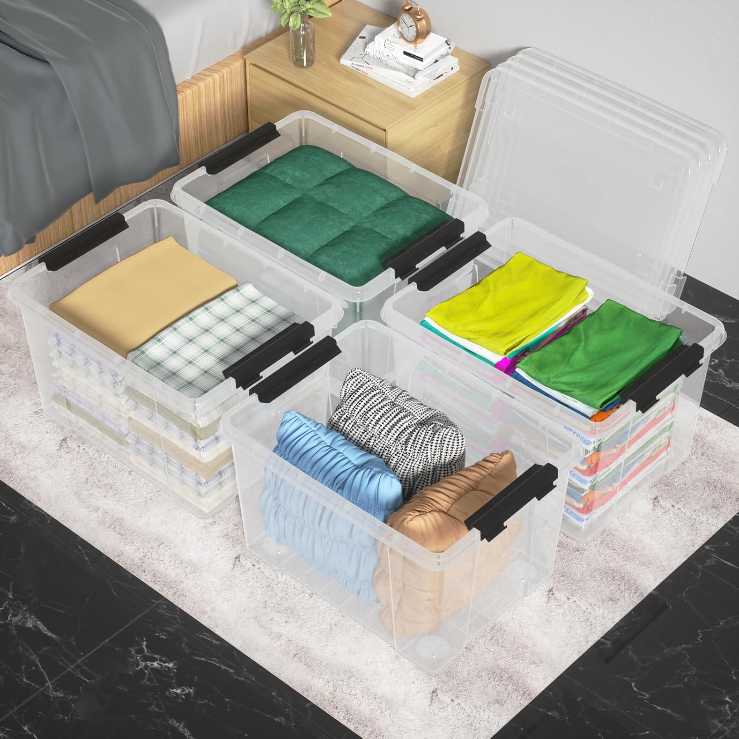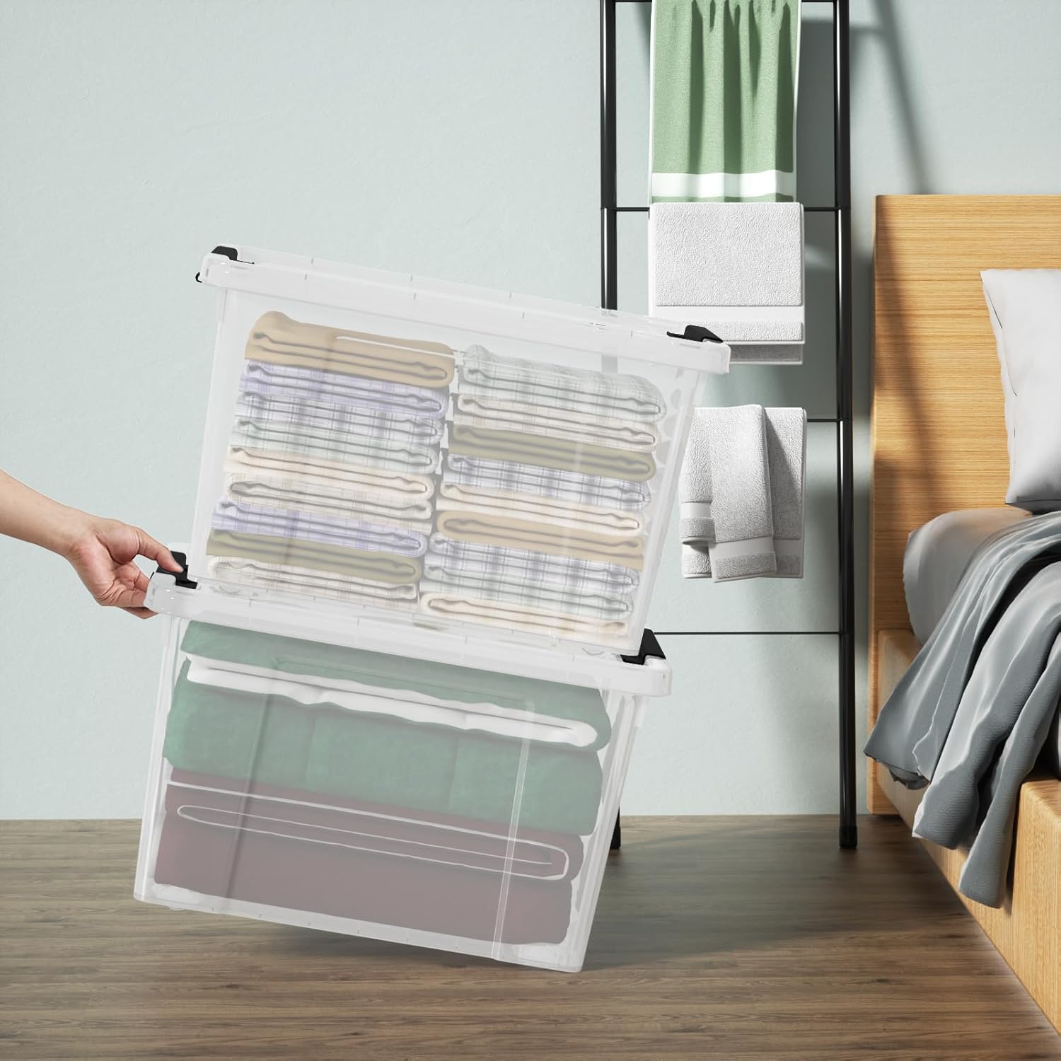 35 Quart Latching Storage Box with Wheels, See-Through Base Plastic Container Bins with Secure Latching Lid, Black Latch, (4-Pack)