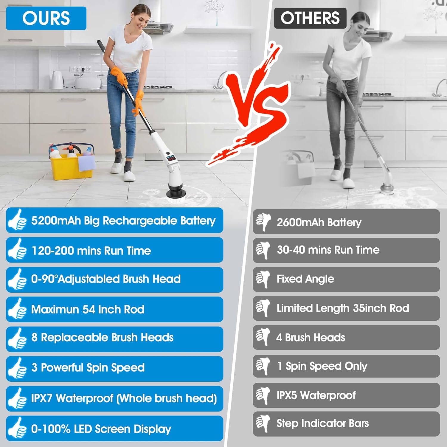 - Wide Application: It's lightweight and easy to assemble, 8 different interchangeable heads each designed for a specific surface or type of grime, ensuring the best tool and optimal cleaning effectiveness no matter the task at hand. Buy this electric cleaning brush and enjoy its excellent results using on tough stains for walk-in showers, bathtubs, grout on tile, bathroom/kitchen sinks, toilets, tiles, bathrooms, floors, windows, kitchen counters, carpets even cars