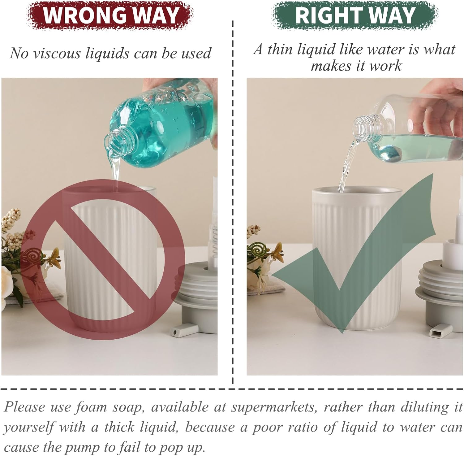 - Multi-use: The beige soap dispenser used for foam hand soap filler and foam dish soap filler. And after removing the pump head, it can be used as a tumbler or toothbrush holder.