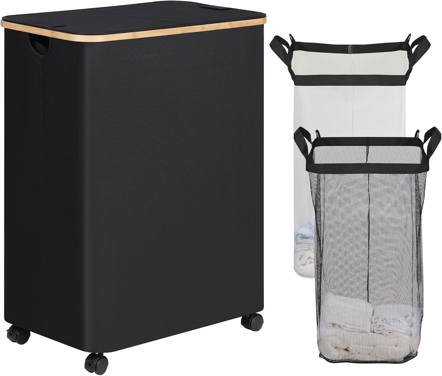 efluky Double Laundry Hamper with Wheels, Divided Laundry Hamper with Removable Bags, 2 Section Dirty Clothes Basket with Handles for Bathroom, Bedroom & Laundry Room, 160L Dark Black