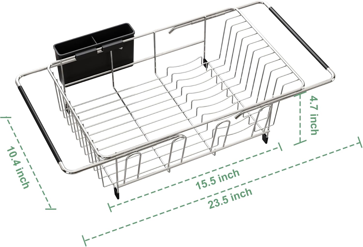 Over The Sink Expandable Dish Drainer Drying Rack in Stainless Steel for Small Kitchen, Counter Space Saving Modern Compact Metal Above Plate Dryer Strainer, Adjustable Hanging Inside Drain Holder