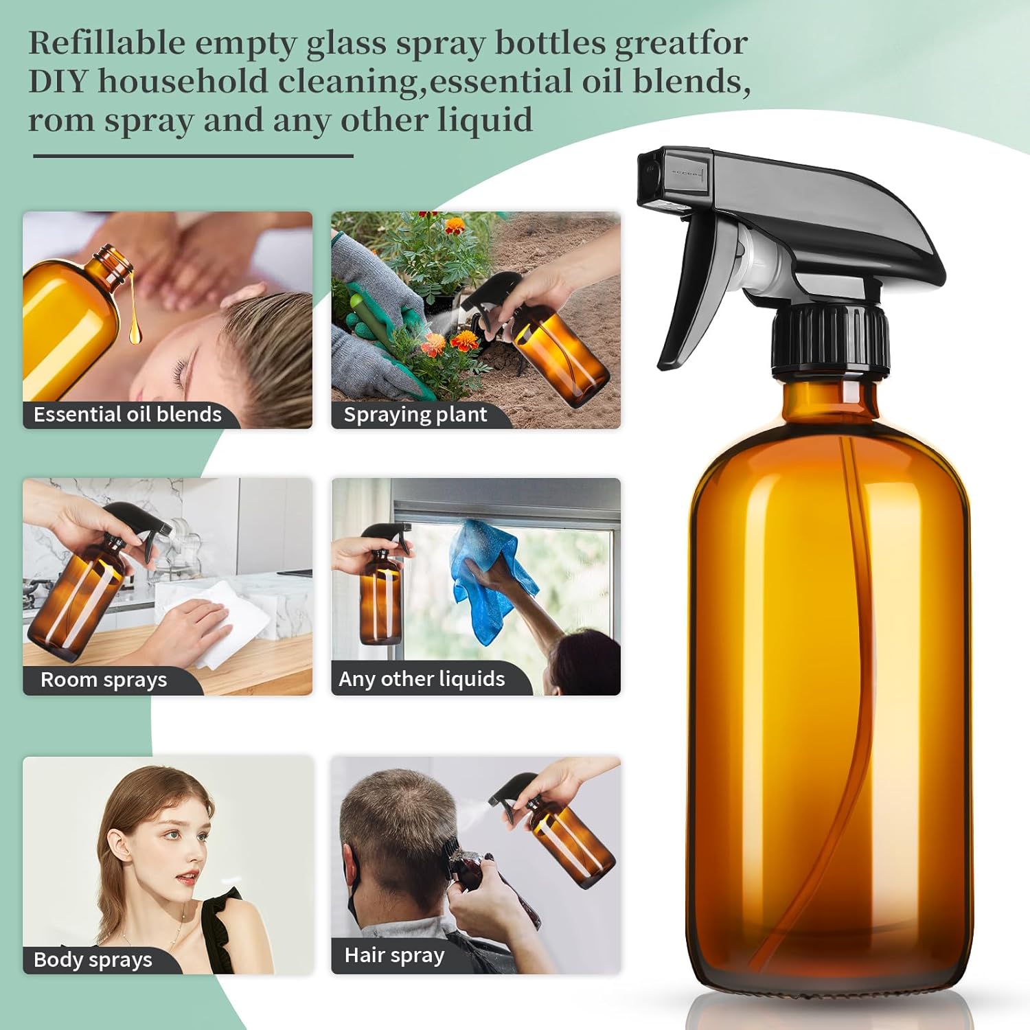 - PRESERVE THE ORIGINAL STATE: 16oz amber glass spray bottles protects light-sensitive liquids in their original state,no longer have to worry about light sensitive light causing your mixtures to lose potency over time,keeps your essential oils safe plus the glass is not affected by oils like citrus