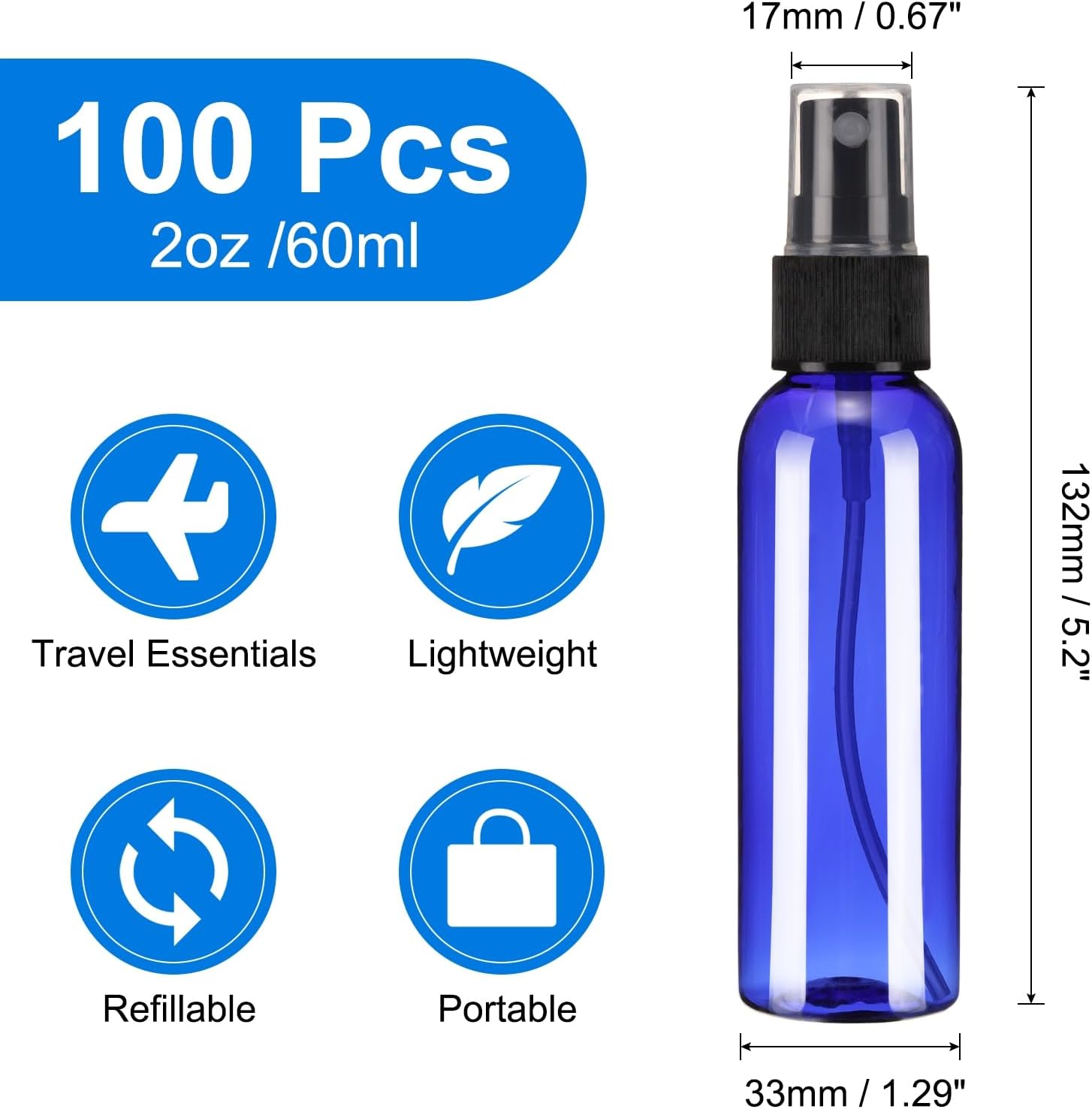uxcell 100 Pack Spray Bottles, 2 Oz/60ML Reusable Clear Empty Mist Plastic Mini Travel Bottle Set,Small Refillable Liquid Containers for Household Use, Essential Oil(Blue Black)