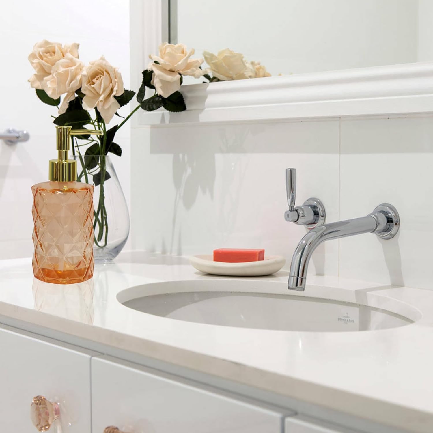Glass Soap Dispenser with Gold Plastic Pump, 12oz Refillable Liquid Hand Soap Dispenser, Crystal Lotion Bottle for Modern Home Decor, Bathroom, Kitchen Countertop, Hotel(Amber)