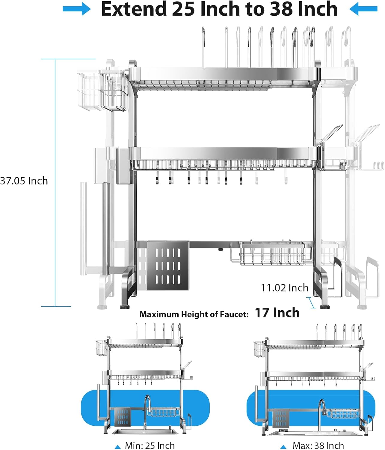 - 【Expandable Length Design】Designed with expandable length, the dish drying rack over the sink fits almost most sizes of kitchen sinks, the Min width is 25” and Max width is 38", you can freely adjust length according to your needs. Large capacity can help you storage a lot of kitchen items.