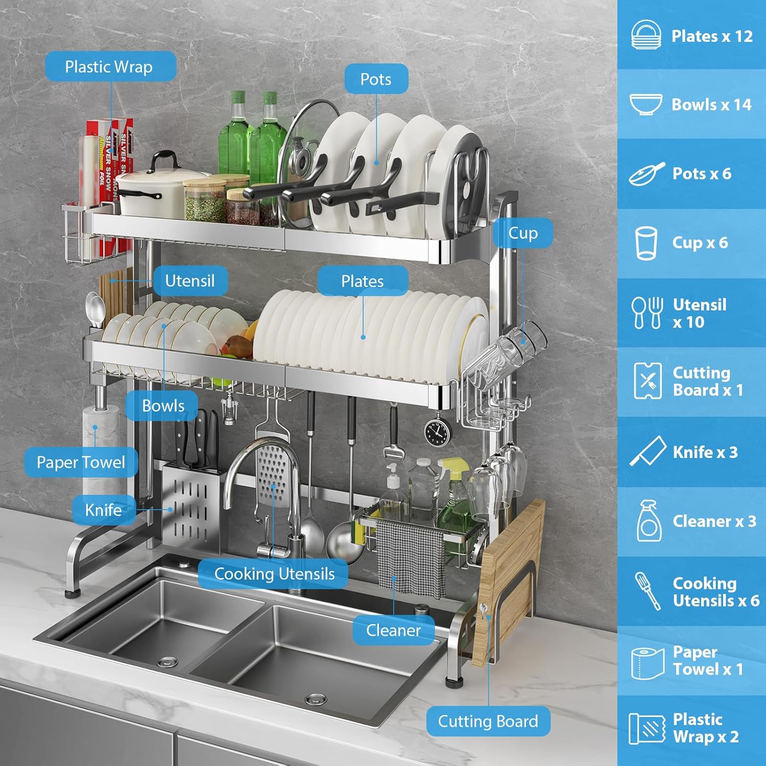 - 【Multifunctional Kitchen Organizer】This over the sink drying rack features a multifunctional design that contains dish drying rack, pots and pans rack can meet your most needs for kitchen storage. Besides, added pot lid holders for more convenience. All the accessories are complete, including knife holder, storage basket, cutlery holder, cutting board rack, cup hanging, hook up, paper holder. (All accessories are made of stainless steel).
