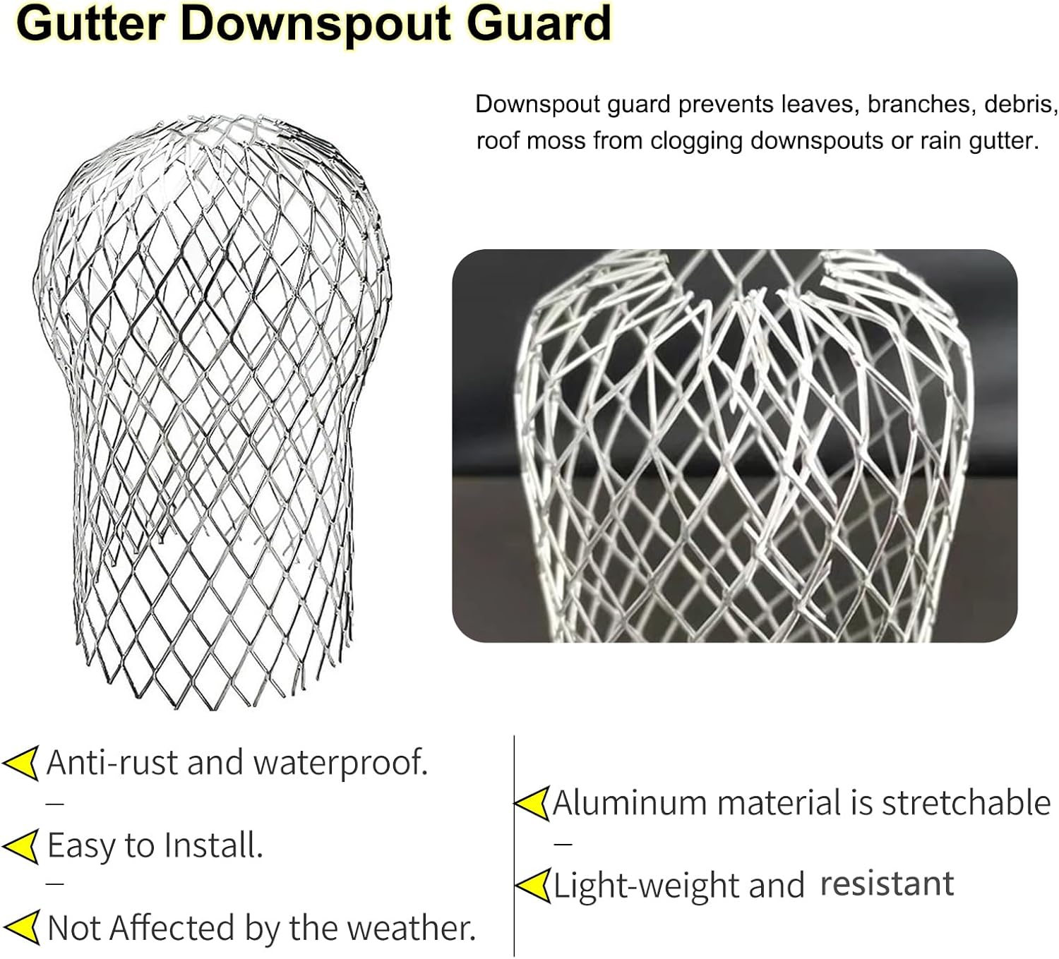 - Effective Guard Gutter: Downspout guard prevents leaves, branches, debris, roof moss, and small animals from clogging downspouts or rain gutter.
