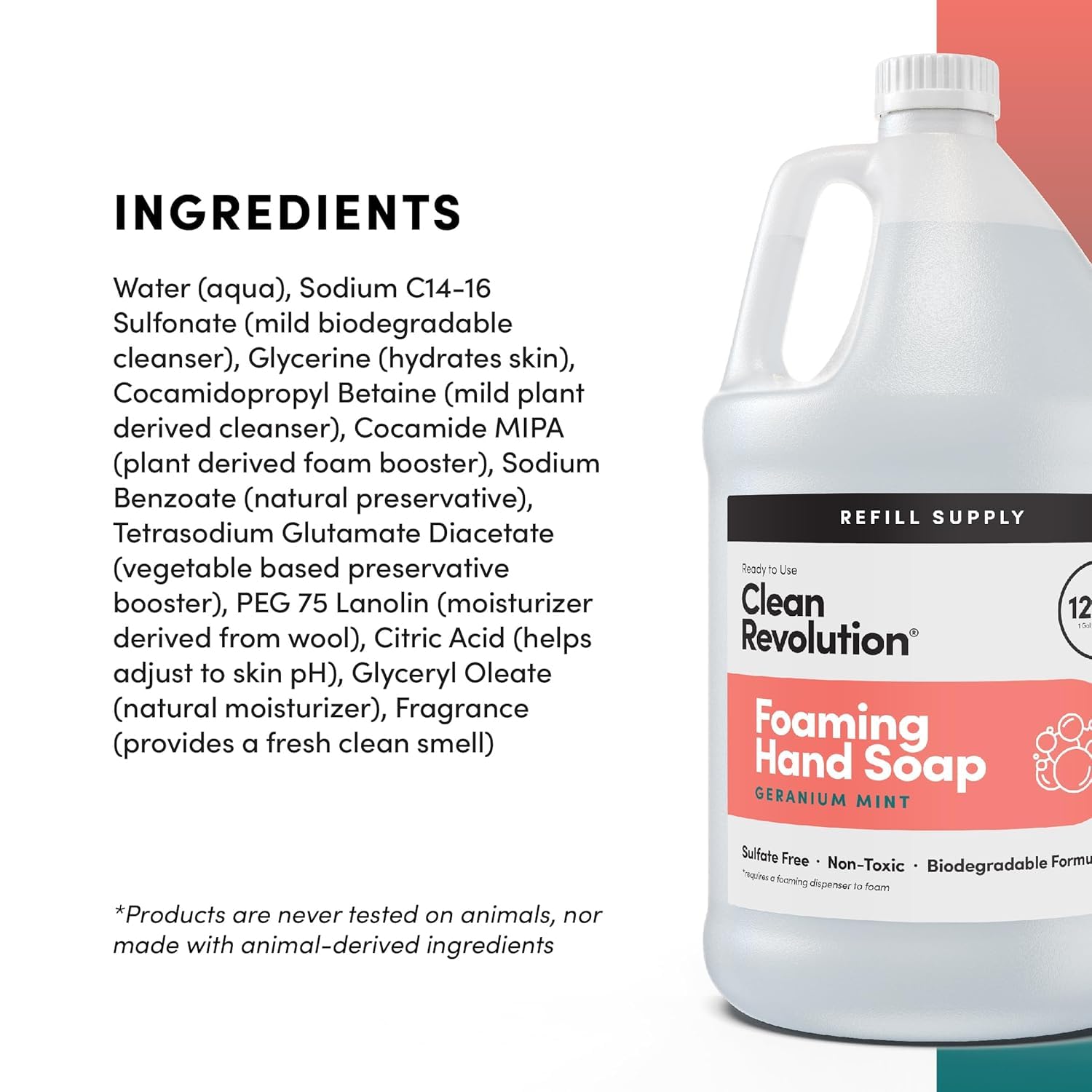Clean Revolution Foaming Hand Soap Refill Supply Container, Ready to Use Formula, Gluten Free, Geranium Mint Fragrance, 128 Fl. Oz, 4 Pack - Made in USA