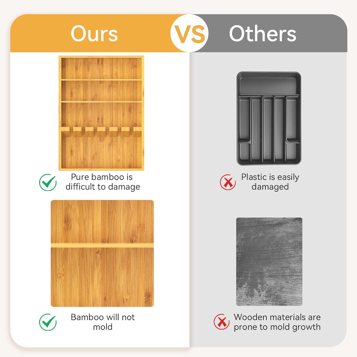 - 【Pure Natural Bamboo Utensil Drawer Organizer】: Our kitchen drawer organizer is made of naturally regenerated bamboo, and the entire silverware drawer organizer is made of pure bamboo material. Bamboo material is not as easily damaged as plastic silverware drawer organizer, nor as moldy as wooden cutlery boxes