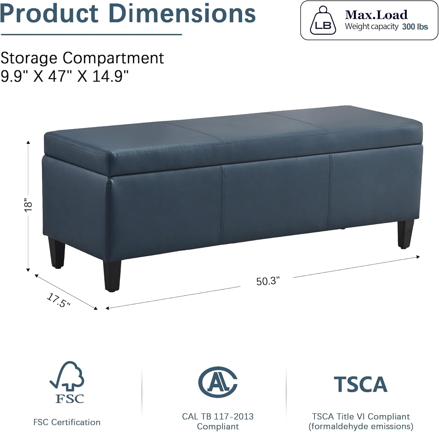 HUIMO Faux Leather Storage Ottoman Bench 50.3 Inch Extra Long PU Upholstered Bedroom Bench with Large Storage Space for The Living Room, Entryway, Bedroom Hold Up to 300lbs (Peacock Blue)