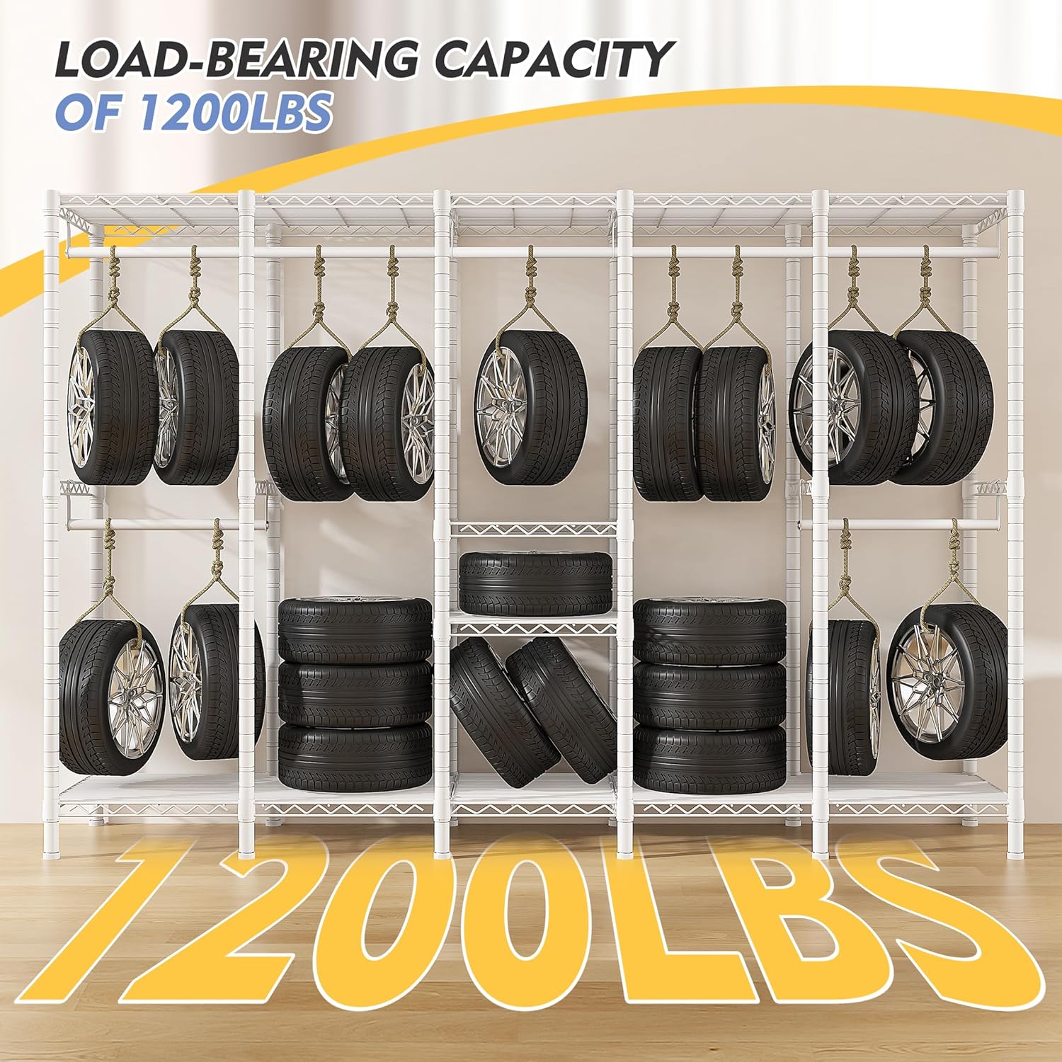 - 【Maximum Bearing Capacity 1200LBS】The clothes racks for hanging clothes takes excellent metal poles and sturdy metal wire, all metal parts are powder-coated which protects sturdy clothes rack from water and rust to makes it easy to clean and ensure years of use. Single hanging rod supports up to 70 lbs, each wire shelf supports up to 90 lbs. Stronger, not bending able to support heavier weights and it will meet long term storage needs. It's great for hanging suits, coats, long dresses, jackets, pants, shirts or other heavy clothes. Offer firm support for beautiful clothes in different seasons